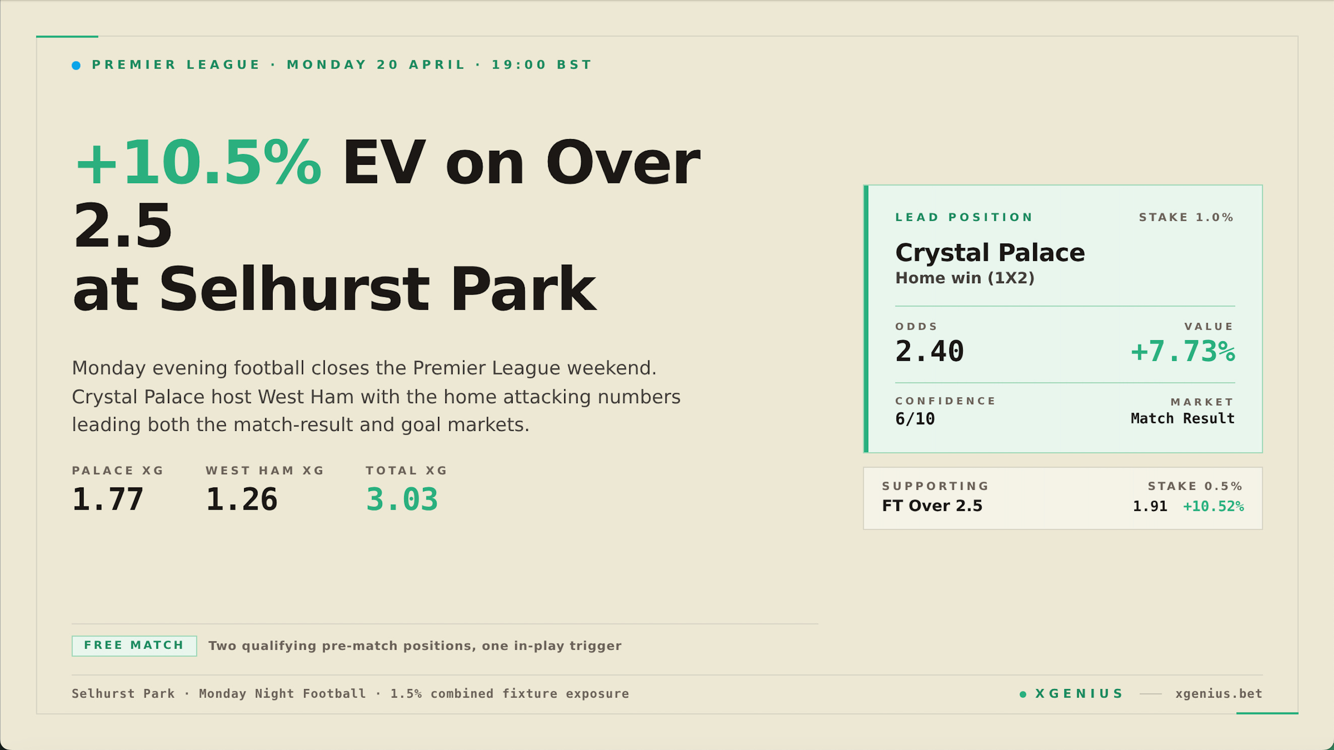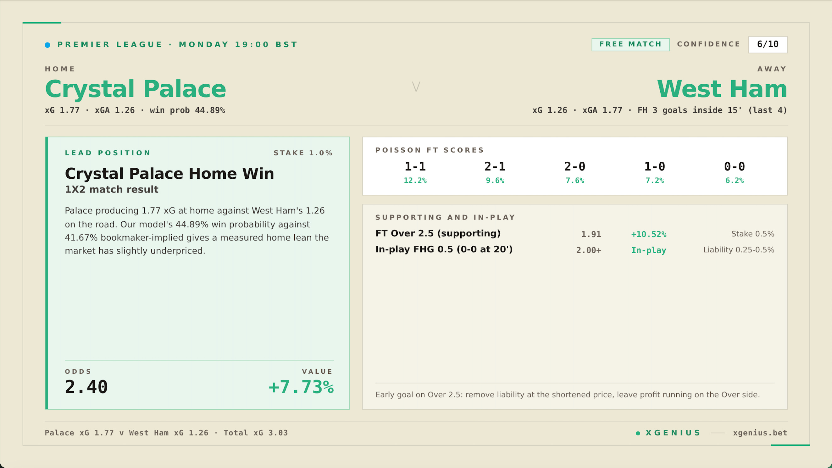 Monday evening football at Selhurst Park closes the Premier League weekend. Crystal Palace host West Ham at 19:00 BST, and our model returns two qualifying pre-match positions: Crystal Palace to win at 2.40 for +7.73% value as the lead, and FT Over 2.5 at 1.91 for a +10.52% value read on the goal side of the fixture. A 1.77 vs 1.26 home/away xG profile backs both positions, and the first-half timing pattern opens a second layer in-play.