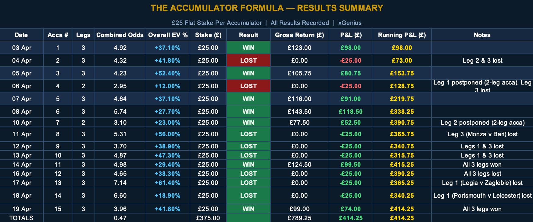 The current record: 7 wins from 15 accumulators, 46.7% strike rate, £375 total staked, +£414.25 net profit.