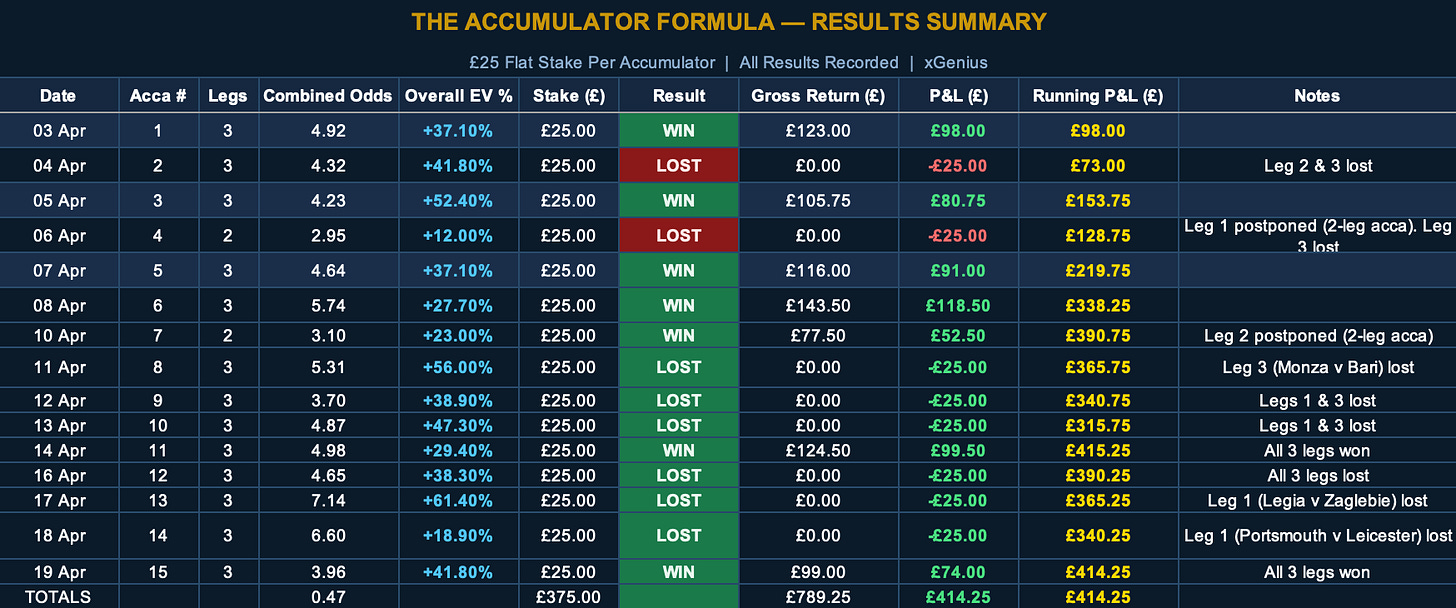 Get the full Accumulator Formula at xgenius.bet, £97 one-off. The qualifying framework, the £25 flat-stake model, and the same daily selections that have turned £375 of stakes into £789.25 of returns since 3 April. One purchase, no subscription. Click through, take the framework, and put the next £25 on Monday’s 4.57.