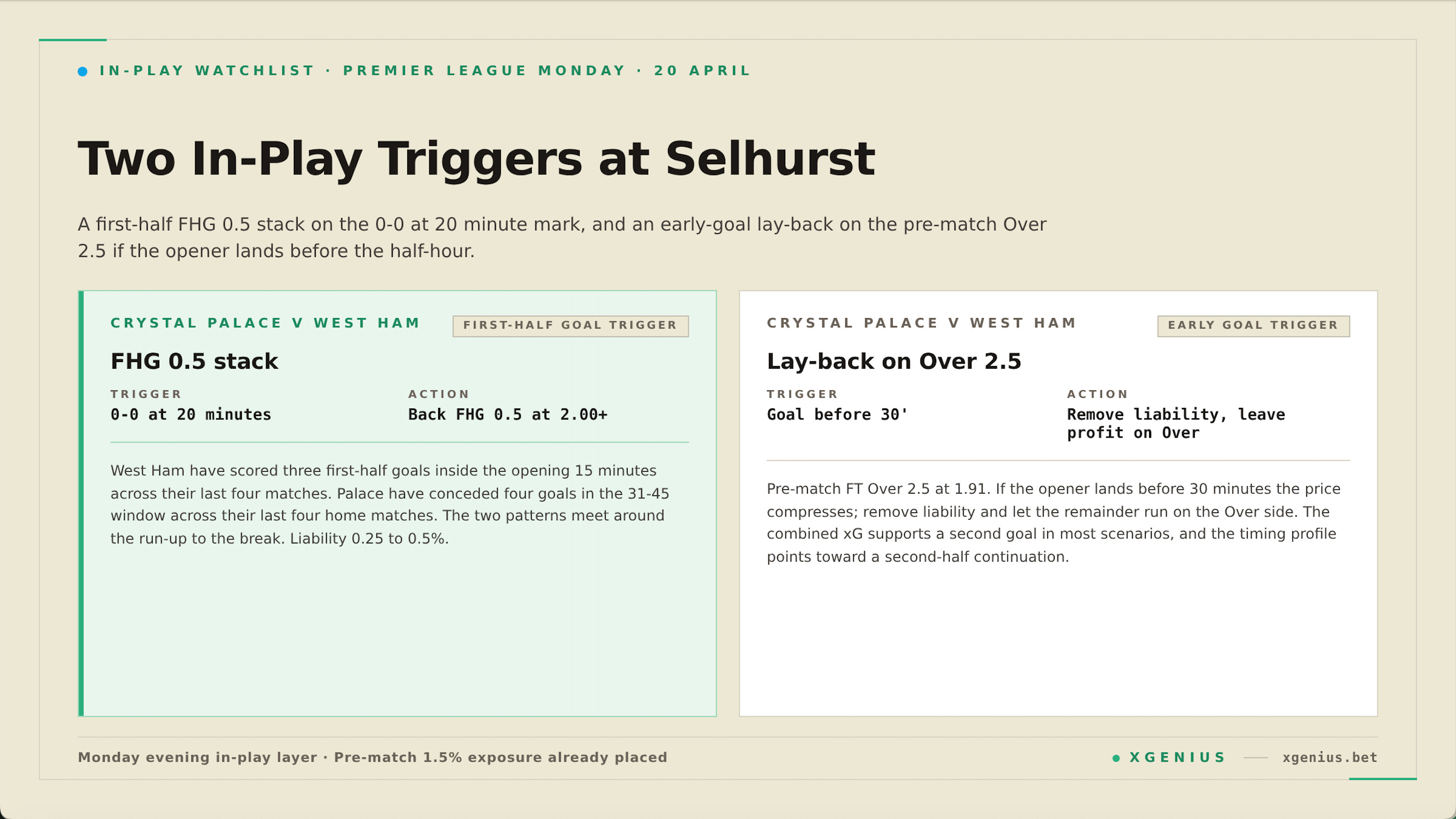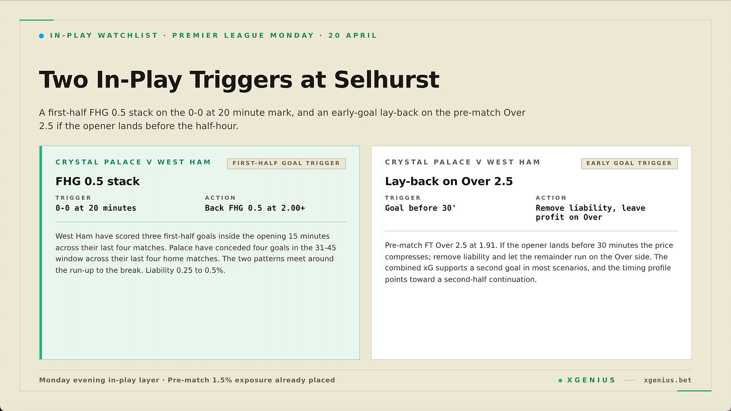 **Crystal Palace v West Ham, early goal on the Over 2.5.** If a goal lands before 30 minutes on the pre-match Over 2.5, remove liability at the shortened price and leave the profit running on the Over side. The combined xG supports a second goal in most scenarios, and the timing profile points toward a second-half continuation once the match opens up.