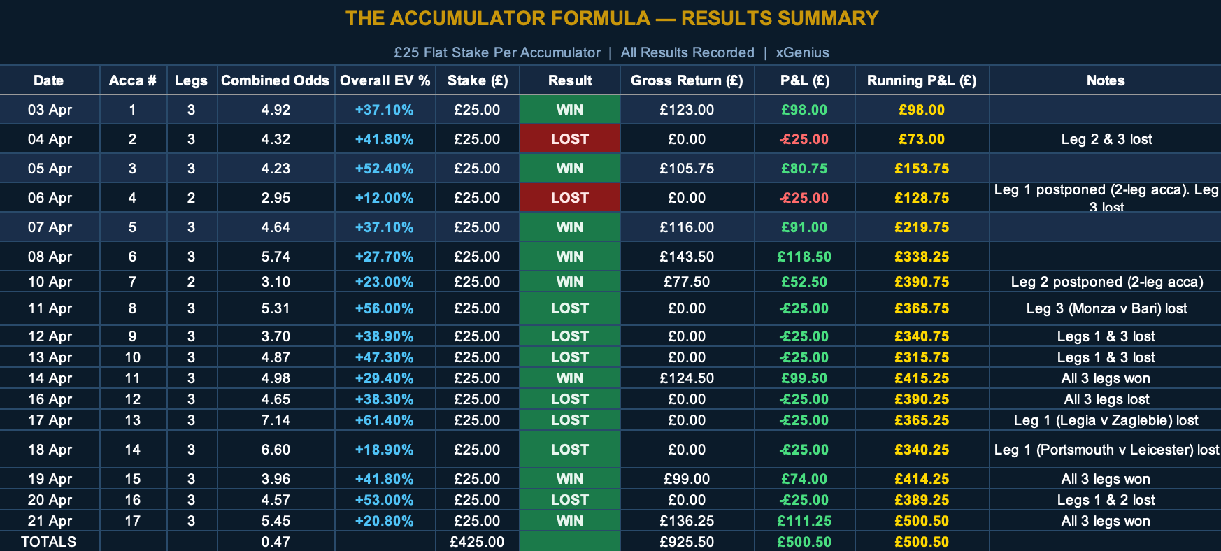 The updated record now reads as 8 wins from 17 bets placed, 47.06% strike rate, £425 total staked, +£500.50 net profit. That works out to a +117.8% ROI across the closed bets, with £925.50 gross returned.
