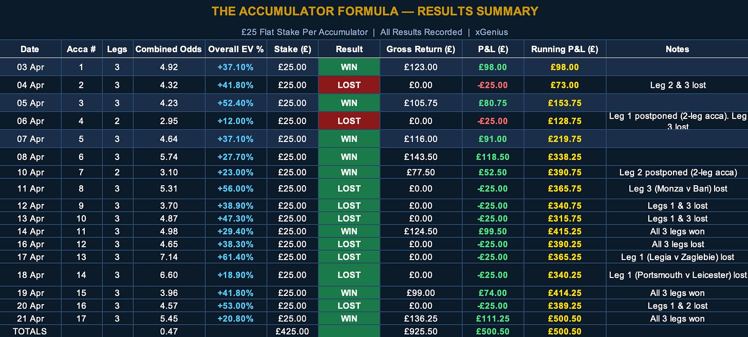 Acca #15 (Sunday 19 April) landed at combined odds of 3.96 on a +41.8% overall EV read. All three legs won, including Manchester City v Arsenal BTTS Yes. Return +£74.00 on a £25 stake.
