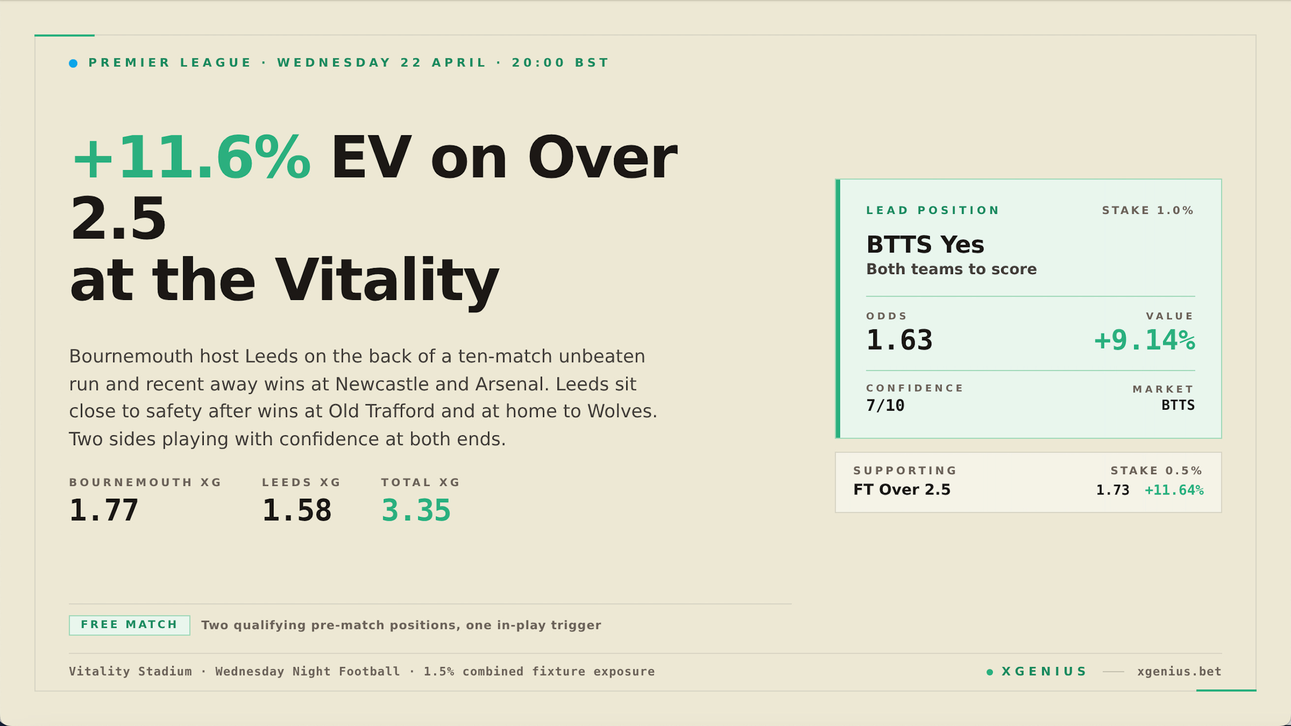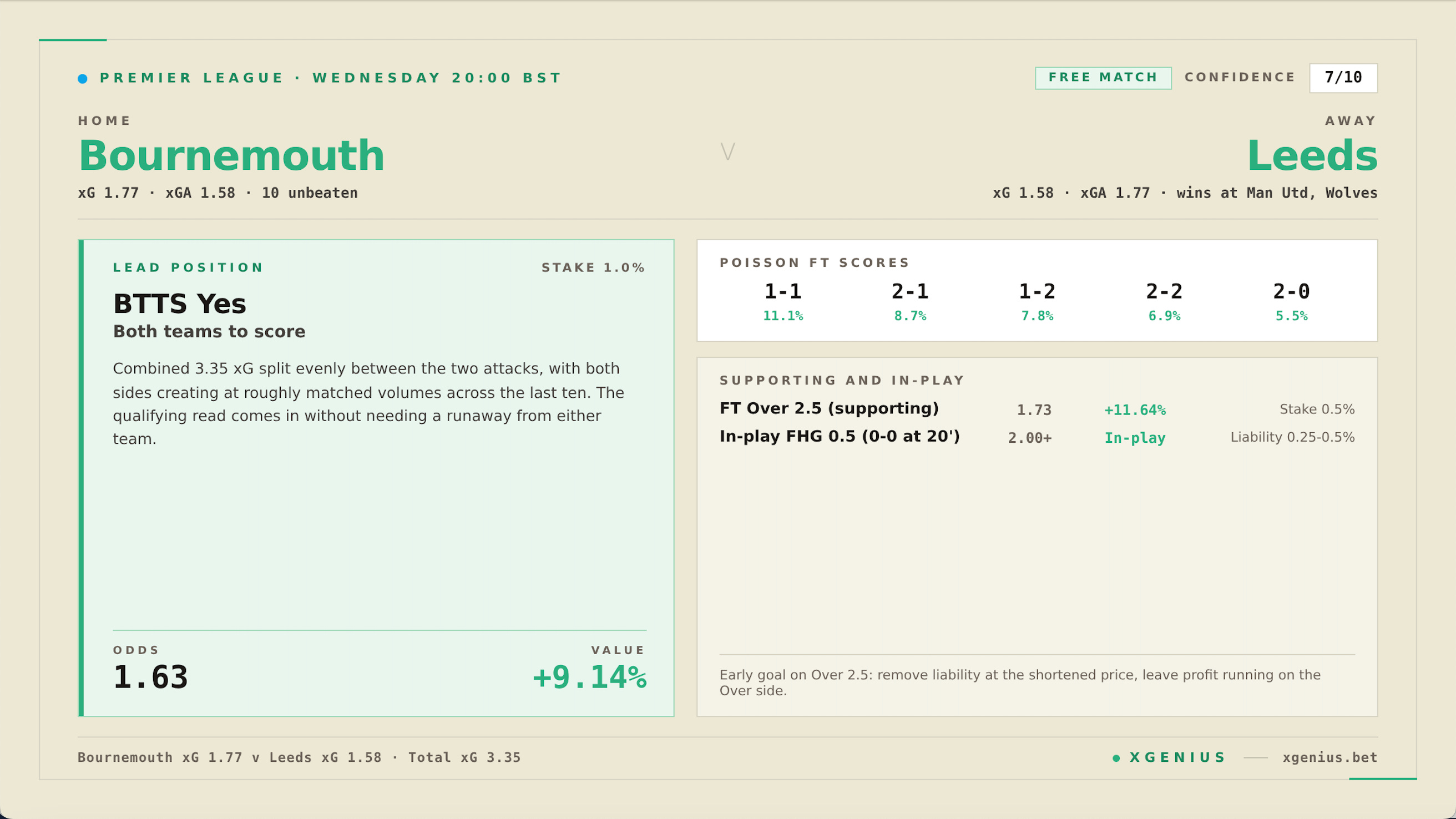 | BTTS Yes | 1.63 | +9.14% | 1.0% | 7/10 |