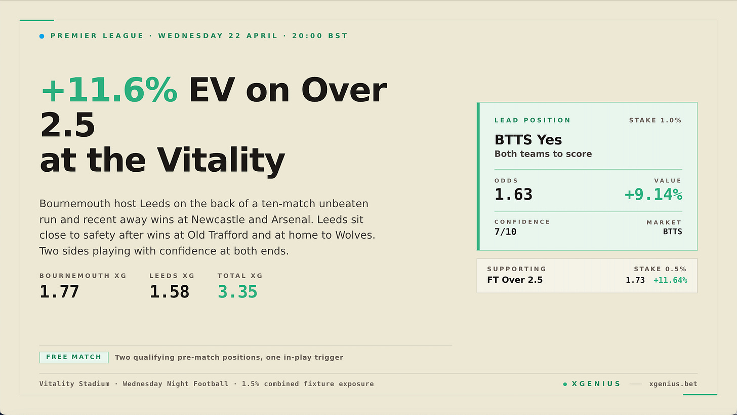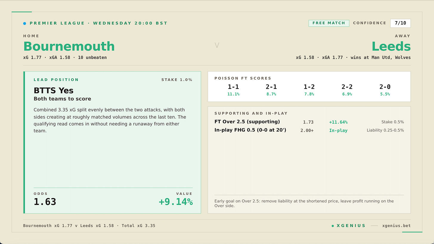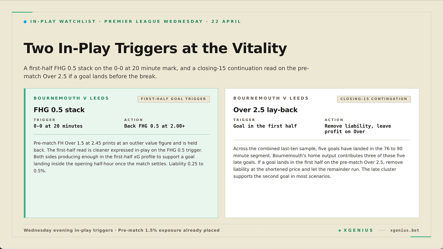 **Bournemouth v Leeds, late-cluster continuation on the Over 2.5.** If a goal lands in the first half on the pre-match Over 2.5, remove liability at the shortened price and leave the profit running on the Over side. The combined xG supports a second goal in most scenarios, and the 76 to 90 minute cluster points toward a closing-15 contribution once the match is opened up. Keep an eye on late goal opportunities in this one.