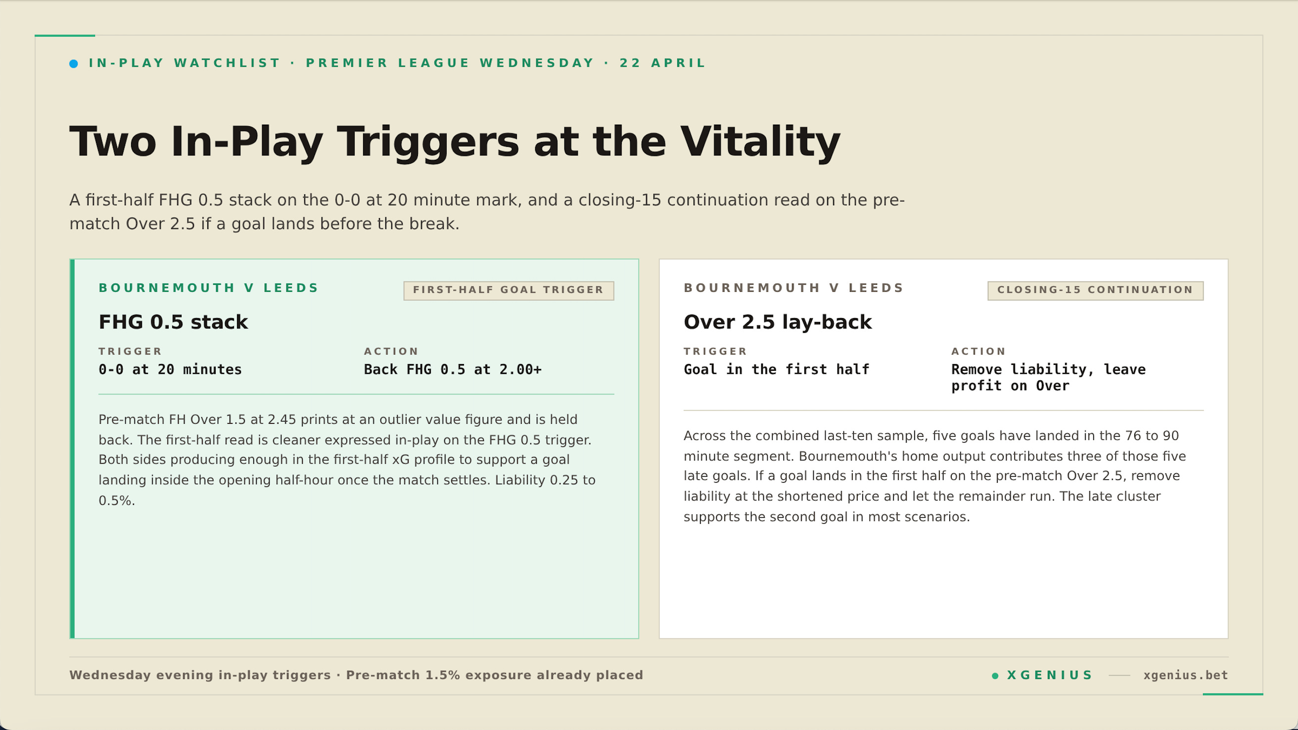**Bournemouth v Leeds, first-half goal trigger.** The pre-match FH Over 1.5 price at 2.45 held some interest in our prematch analysis. However, the safer in-play approach is monitoring FHG 0.5. If the fixture is 0-0 at 20-25 minutes with strong xG indicators and attack pressure, back FHG 0.5 at =>2.00 or above. Liability sizing 0.25 to 0.5%.