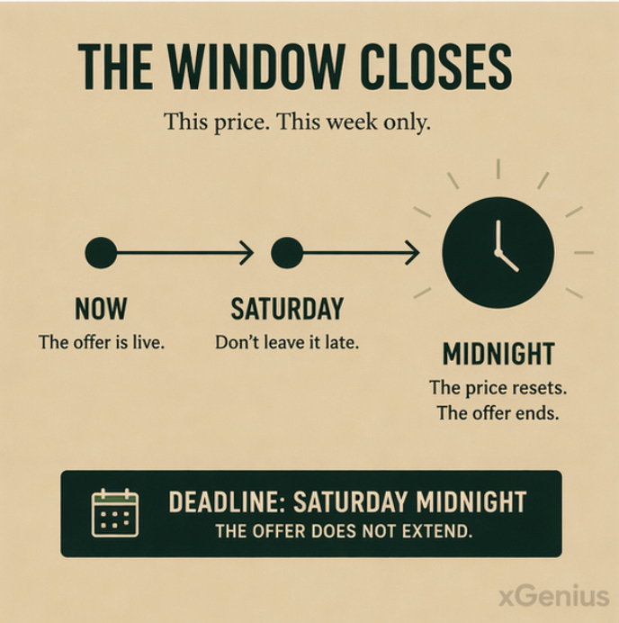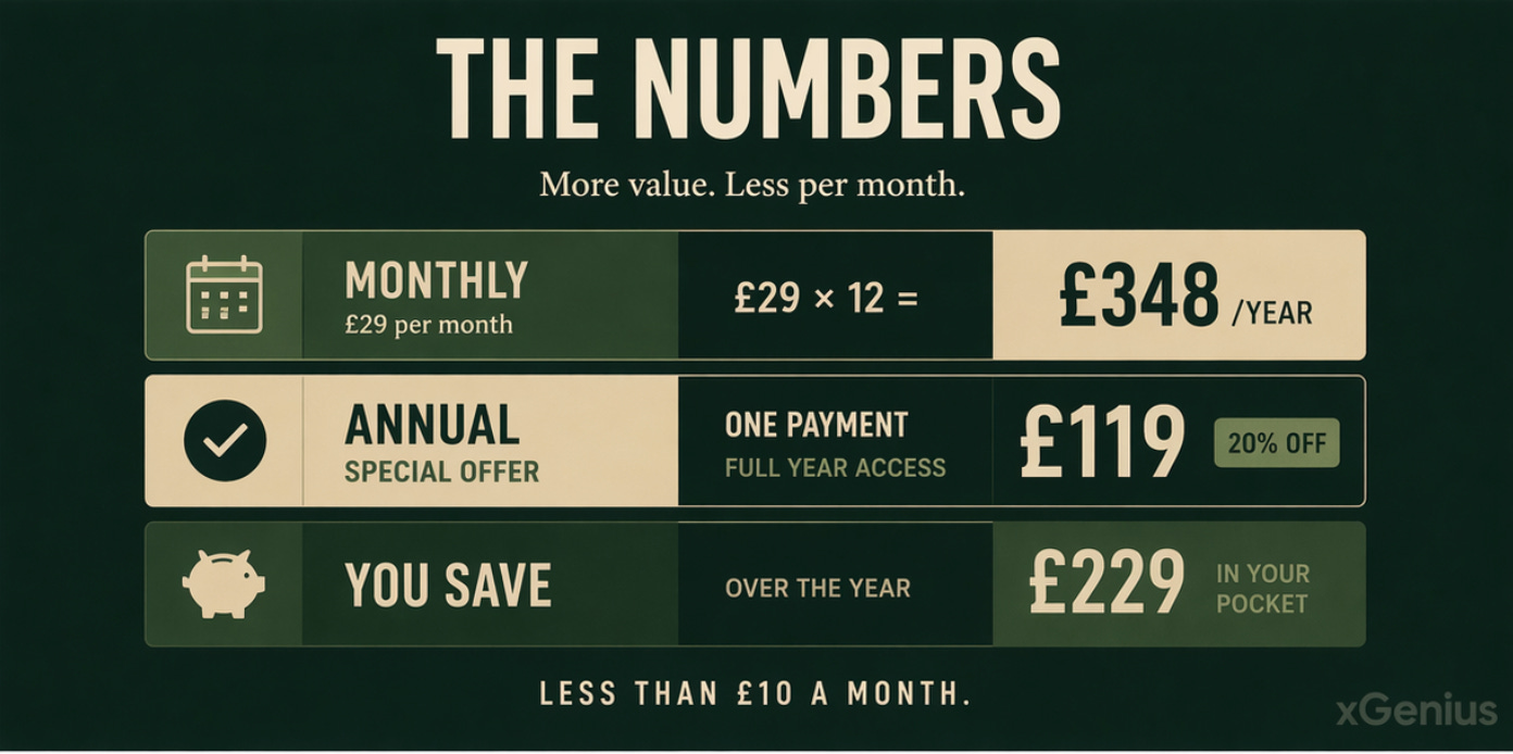 From now until Saturday at midnight, xGenius annual membership is available at £119 instead of £149. Twenty percent off, applied automatically — no code to enter.