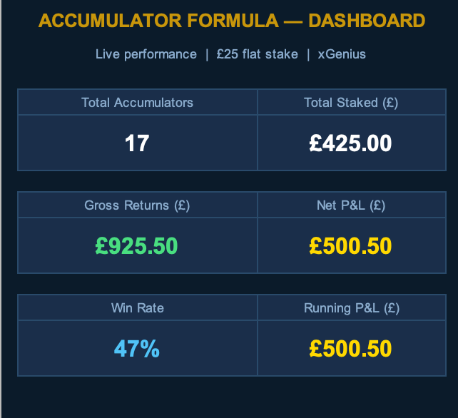 We have continued to go from strength to strength on the Accumulator Formula. Acca #17 landed combined odds of 5.45 and a combined expected value of +20.8%: