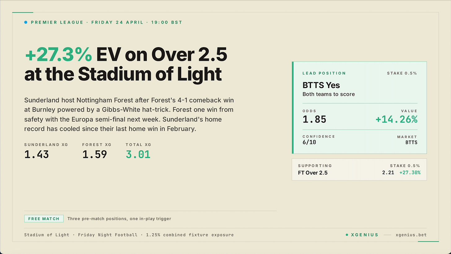 Nottingham Forest come into Friday evening at the Stadium of Light on the back of a comeback win against Burnley last weekend, a 4-1 finish powered by a Morgan Gibbs-White hat-trick. The Europa League semi-final waits for them next week, and one more league win is likely enough to seal Premier League safety. Sunderland have outperformed expectations throughout the campaign and their home record has been the foundation of that overachievement, but the recent picture suggests a side running out of steam: the win against Spurs last time was their first home league success since 3 February.