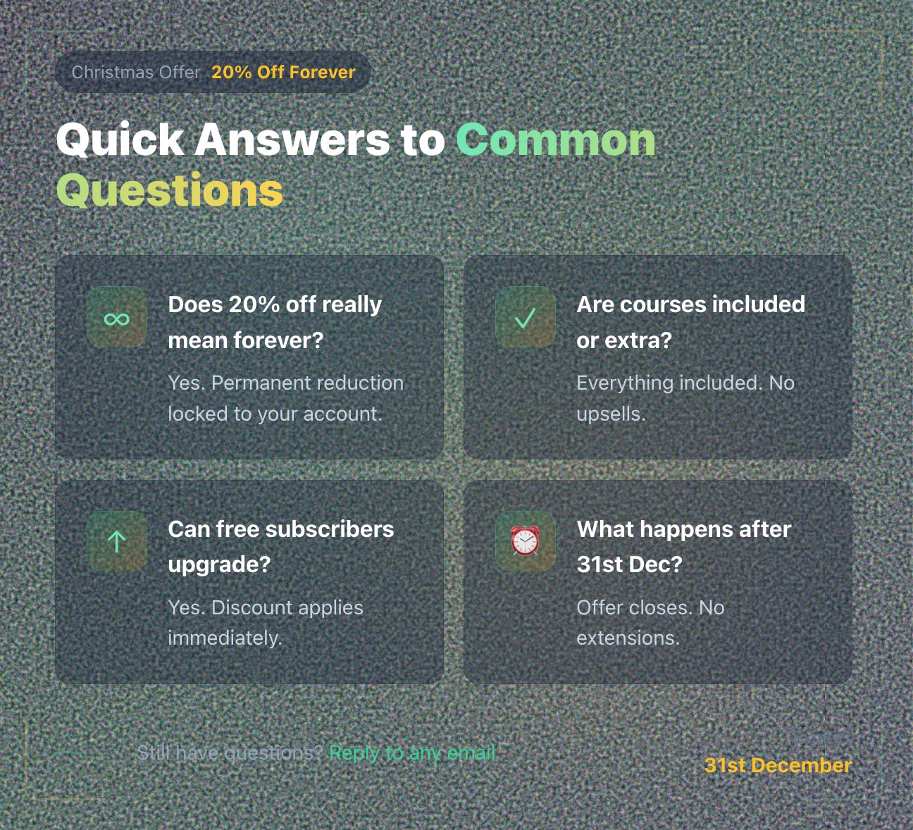 Since launching the Christmas offer, we’ve had a few questions come through. Worth addressing them here.