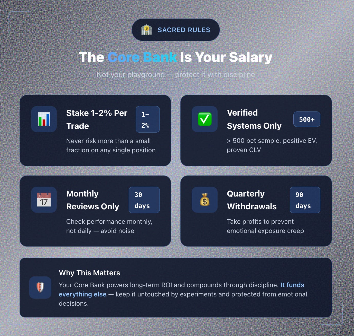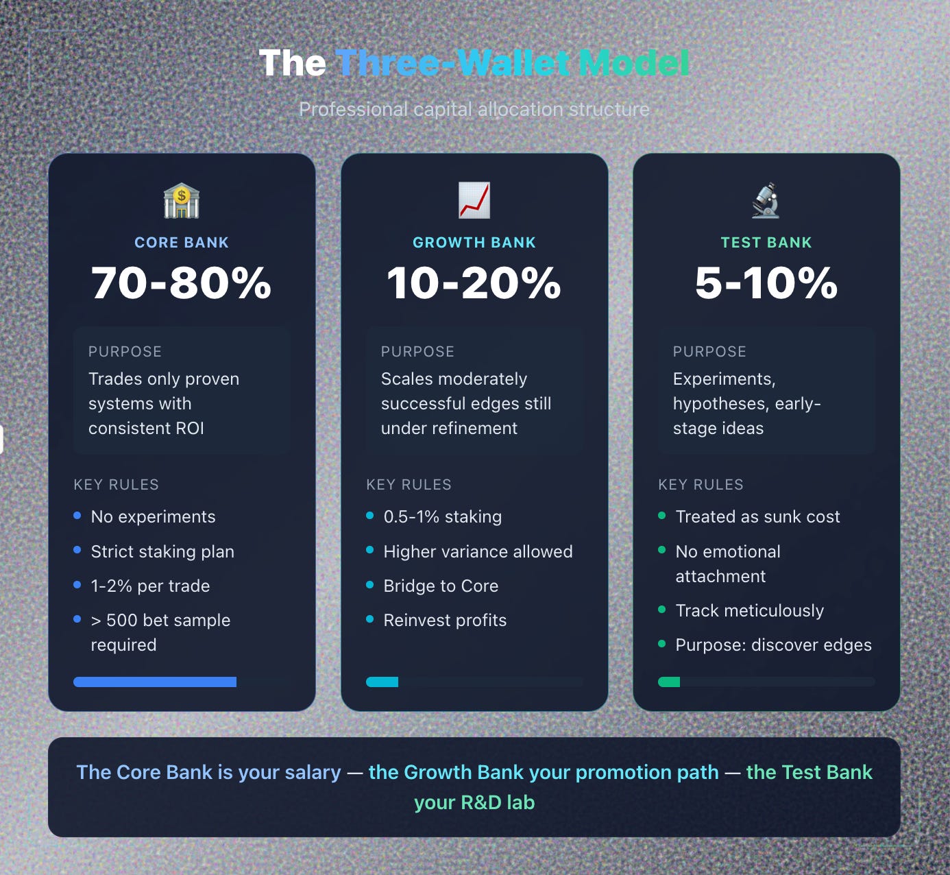 Wallet Purpose Typical Bank % Rules Core Bank Trades only proven systems with consistent ROI. 70–80% No experiments. Strict staking plan. Growth Bank Scales moderately successful edges still under refinement. 10–20% Slightly higher variance allowed. Test Bank Experiments, hypotheses, early-stage ideas. 5–10% Treated as sunk cost. No emotional attachment.