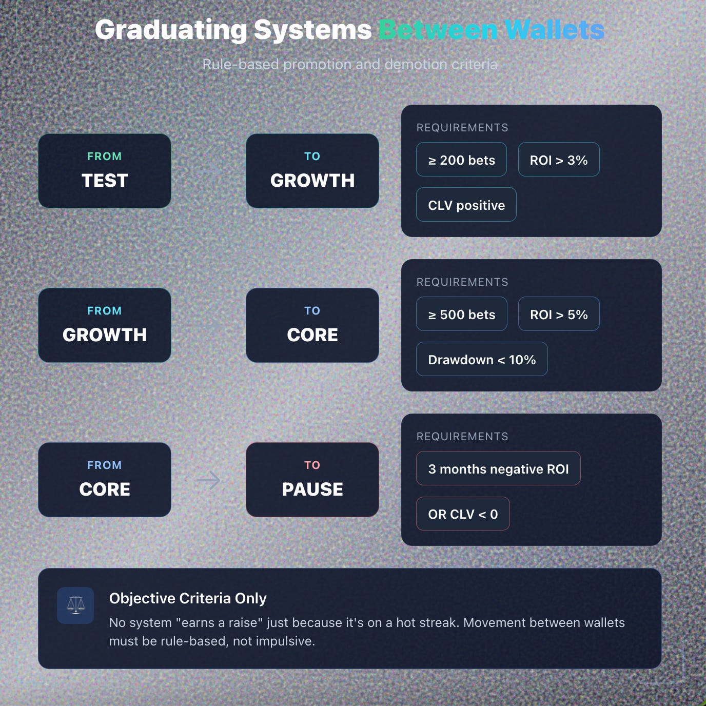 Objective promotion criteria maintain integrity. No system “earns a raise” just because it’s on a hot streak.