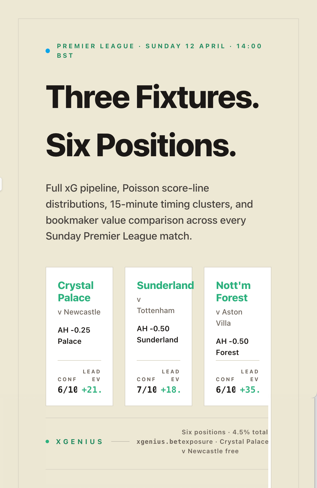 The straight home win at 3.00 is the alternative expression of the same underlying view. Smaller stake, cleaner binary exposure, slightly lower value percentage. The two should be treated as separate positions, not combined.