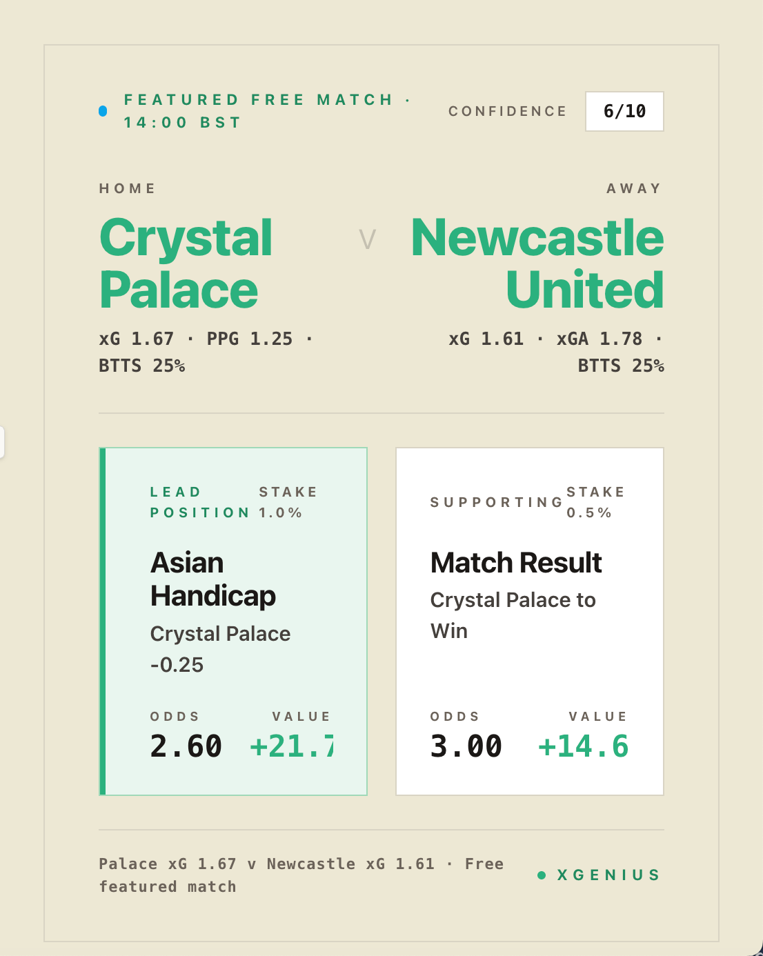 1. **Asian Handicap -0.25, Crystal Palace** at 2.60. +21.70% value. Stake 1.0% of bankroll.
