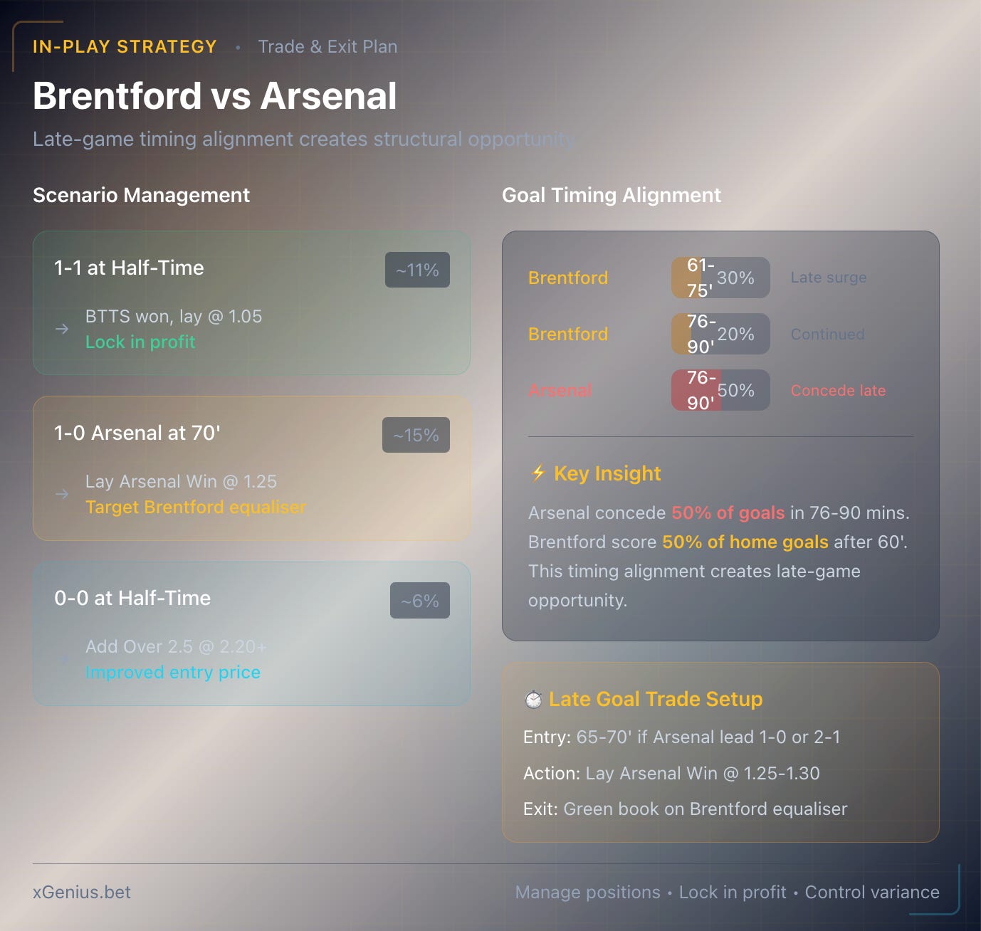 Arsenal concede 50% of their goals in the 76-90 window. Brentford score 50% of their home goals in the 61-90 window. This timing alignment creates a structural late-goal opportunity.