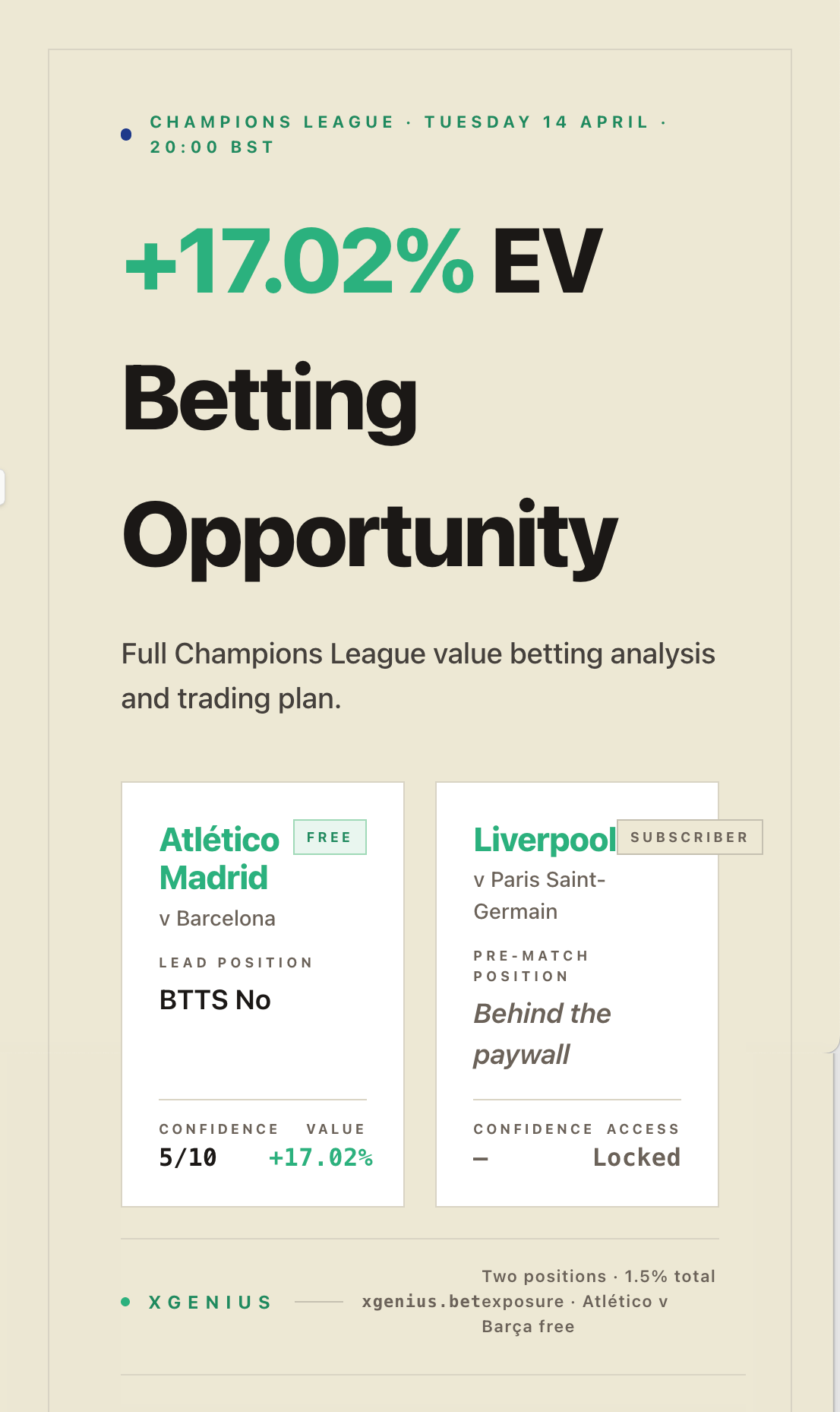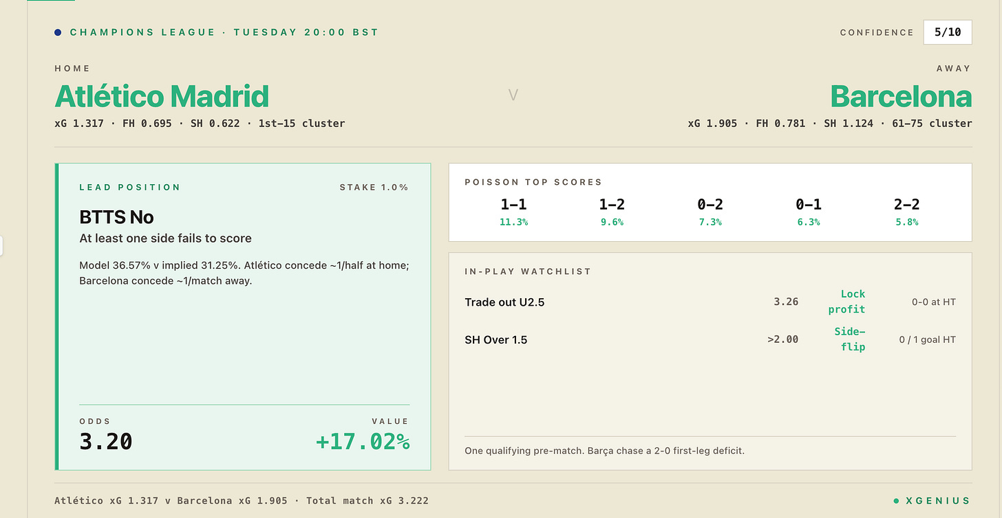 Our model has run the full probability models across each fixture: last-ten xG form, first-half and second-half goal splits, 15-minute timing clusters, Poisson score-line distributions, and bookmaker value comparisons. The write-up below covers only the positions that pass the full qualifying rules.
