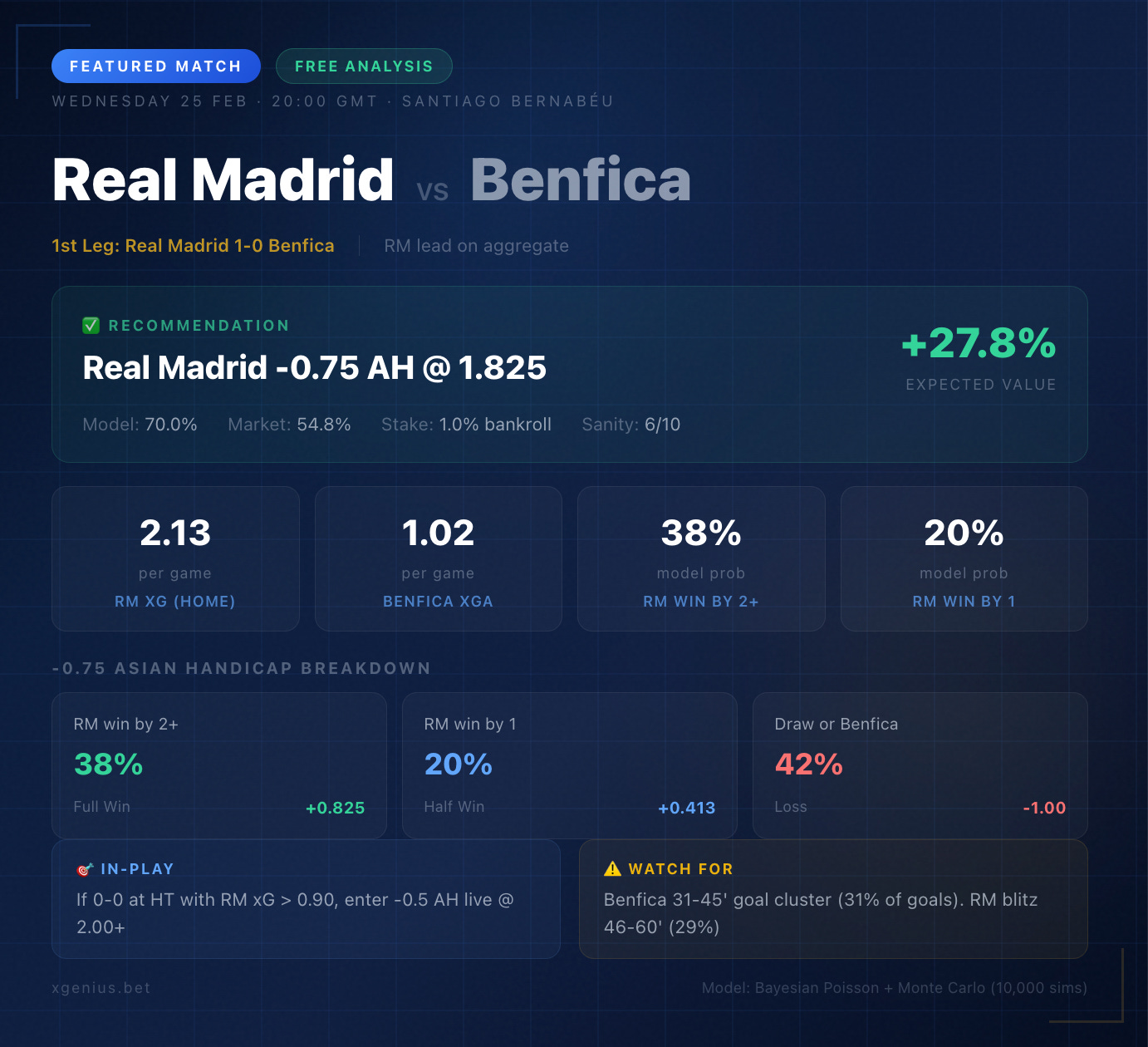 🎯 In-Play: If 0-0 at half-time and Real Madrid’s live xG exceeds 0.90, consider entering the -0.5 AH in-play at odds above 2.00. The Benfica 31-45 minute goal surge (31% of their goals fall in this window) is worth monitoring before the break.