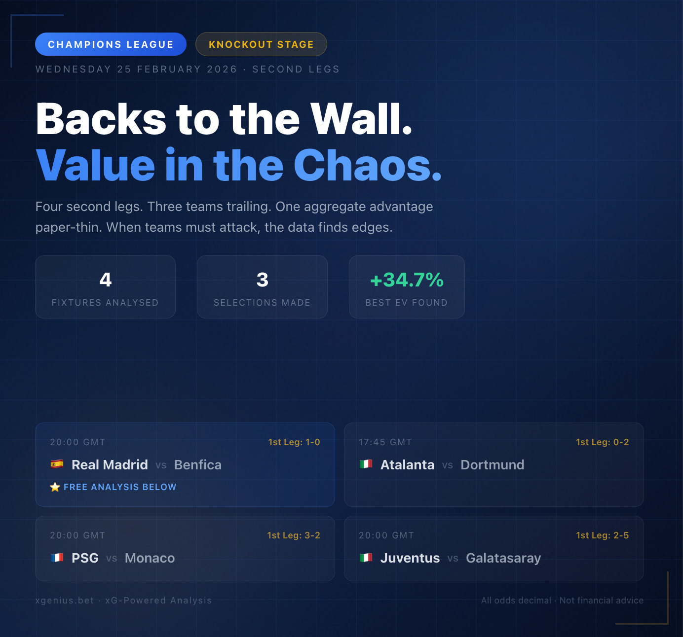 We’ve run all four fixtures through the model — xG profiles, Poisson distributions, Asian Handicap mapping, goal timing clusters, and Monte Carlo simulations. Three made the cut with genuine +EV positions.