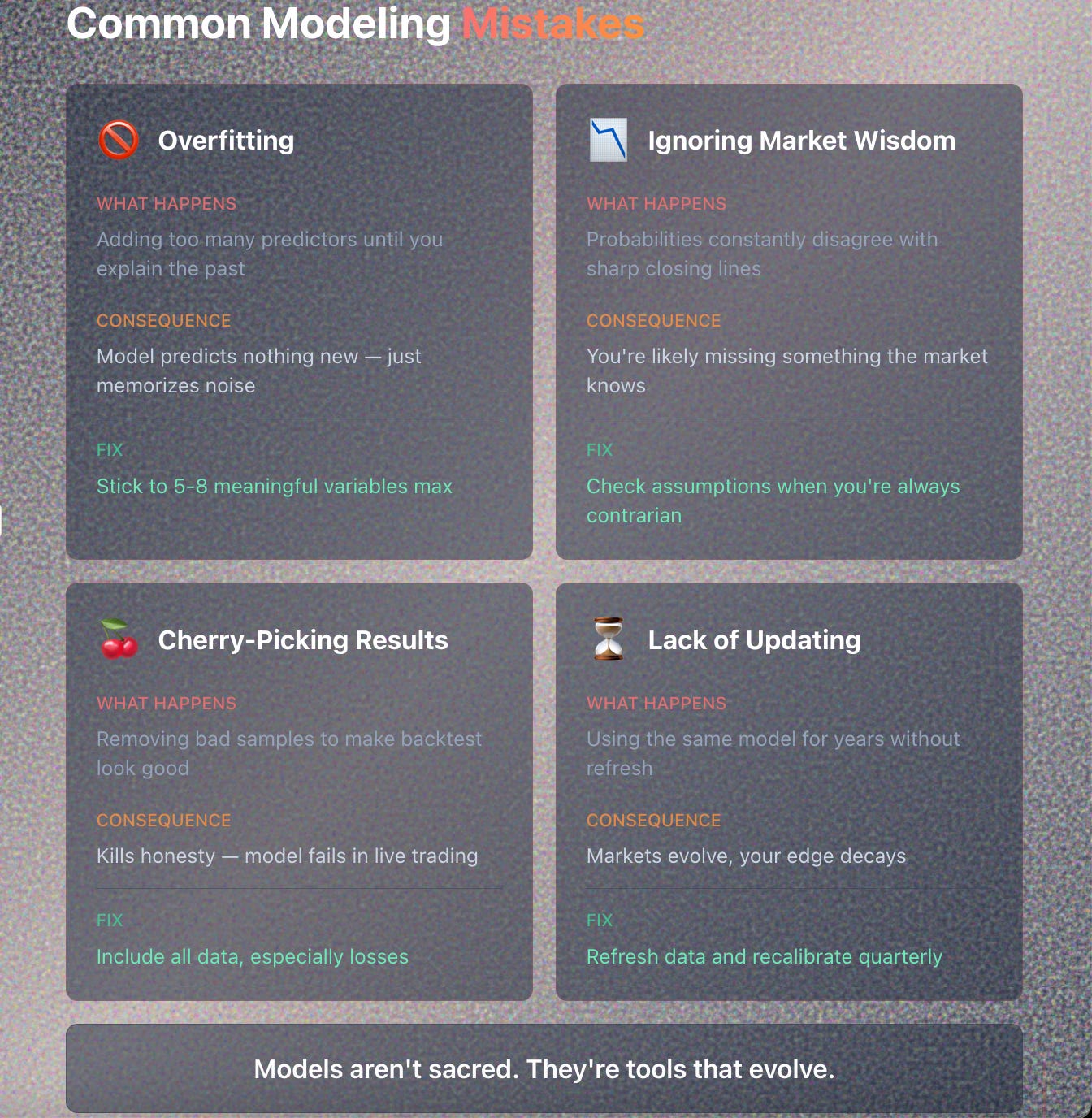 🚫 Ignoring Market Wisdom: If your probabilities constantly disagree with sharp closing lines, check assumptions.