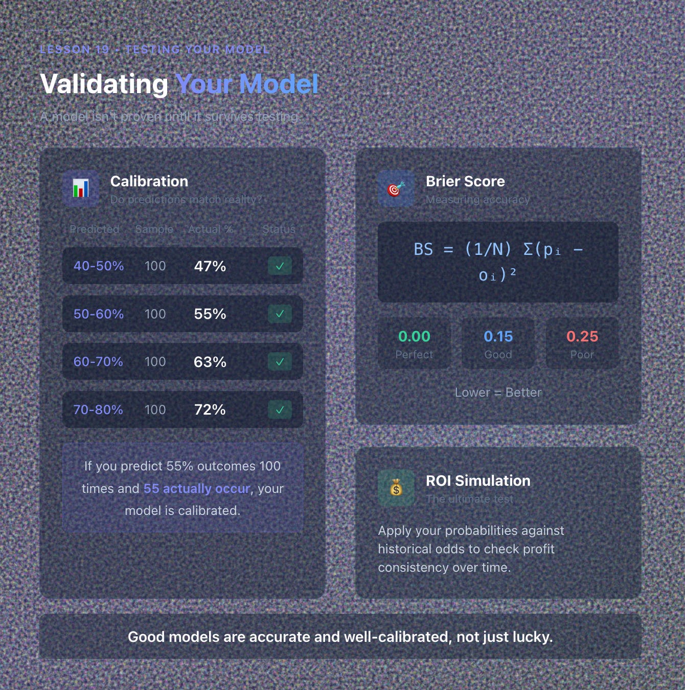 ✅ Validate calibration with Brier scores or probability bins.
