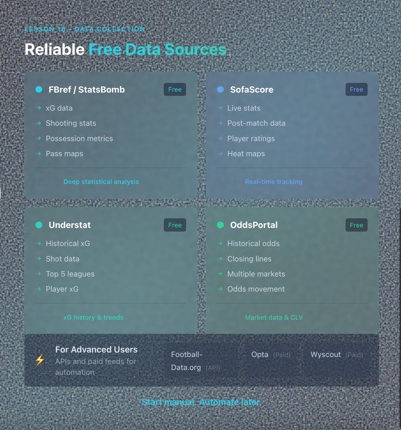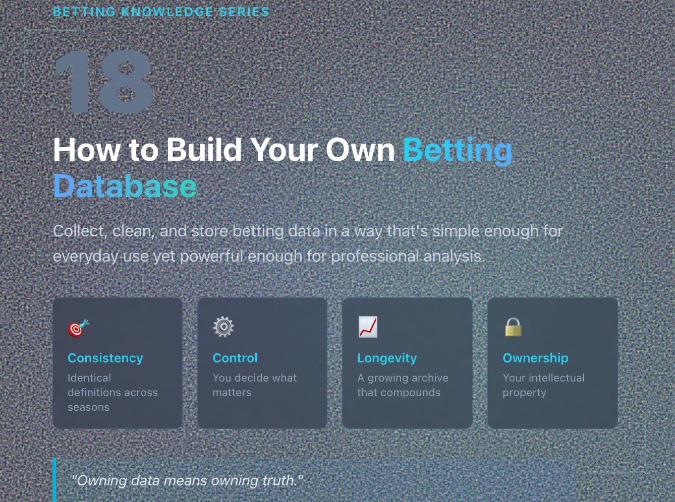 This lesson shows you how to collect, clean, and store betting data in a way that’s simple enough for everyday use yet powerful enough for professional analysis.