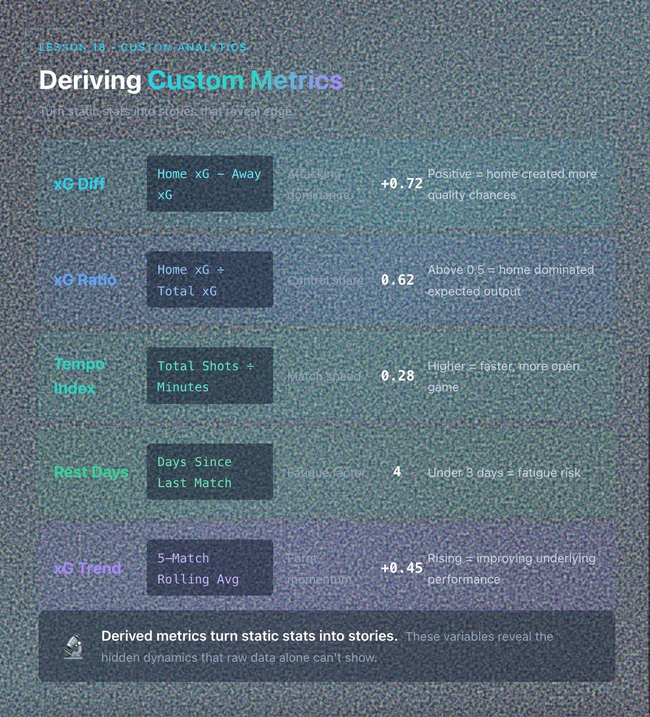 Metric Formula Meaning xG Diff Home xG - Away xG Attacking dominance xG Ratio Home xG / Total xG Control share Tempo Index (Total Shots ÷ Minutes) Match speed Rest Days Days since last match Fatigue factor xG Trend (5-match avg) Rolling mean of xG Diff Form momentum