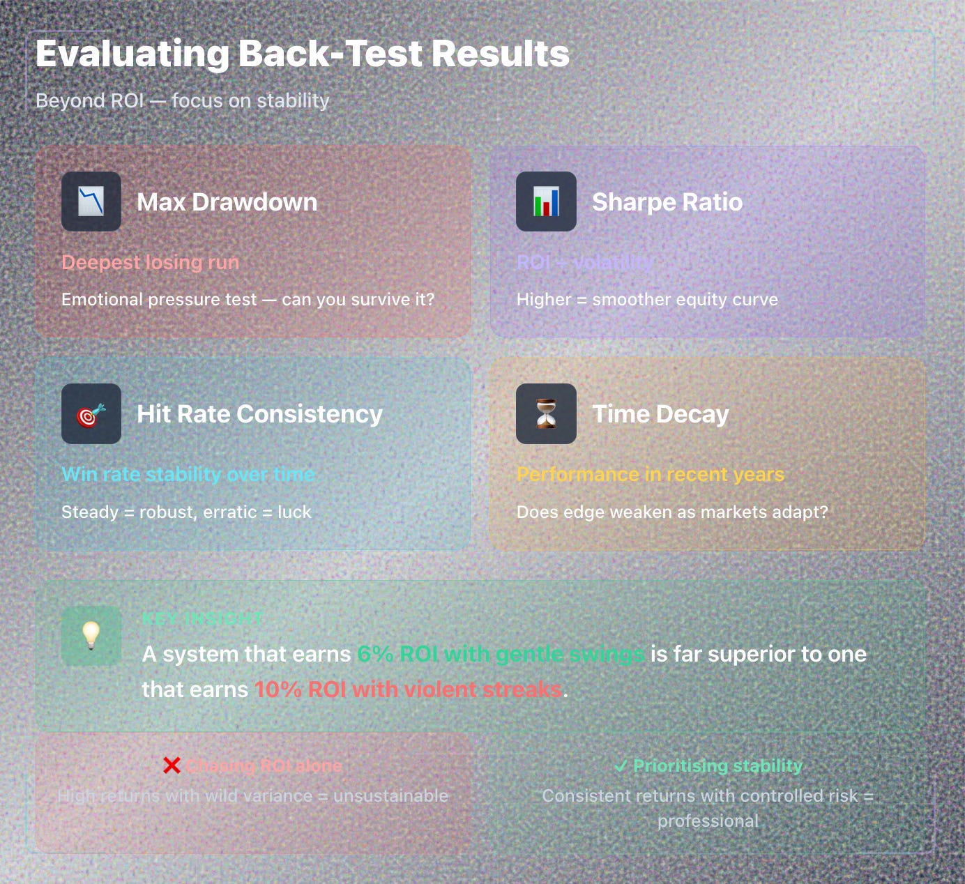 A system that earns 6% ROI with gentle swings is far superior to one that earns 10% ROI with violent streaks.