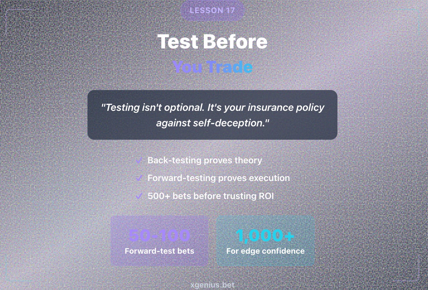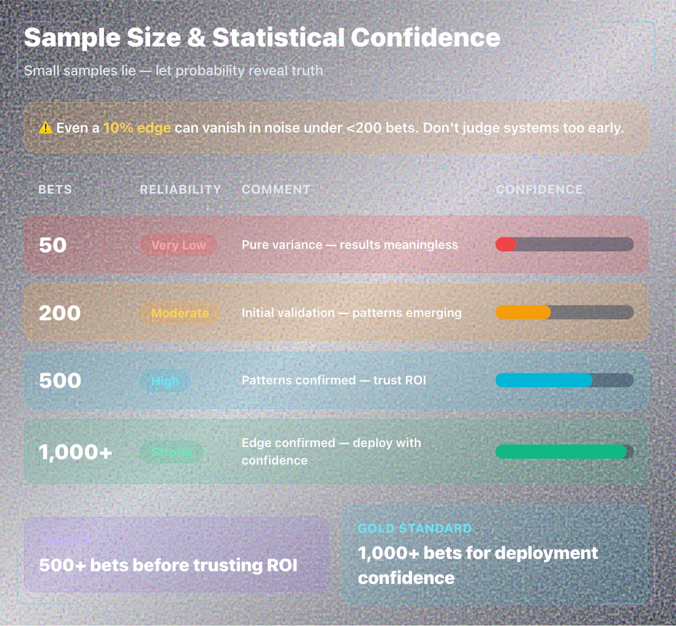 Bets Reliability Comment 50 Very low Pure variance 200 Moderate Initial validation 500 High Patterns emerge 1,000+ Strong Edge confirmed