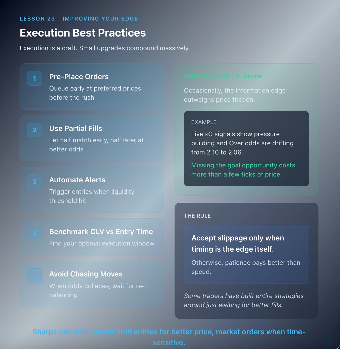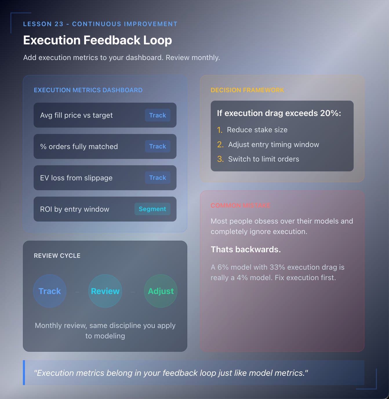 If execution drag exceeds limits, adjust stake size or timing. Same feedback discipline you apply to modeling. Most people obsess over their models and completely ignore execution. That’s backwards.