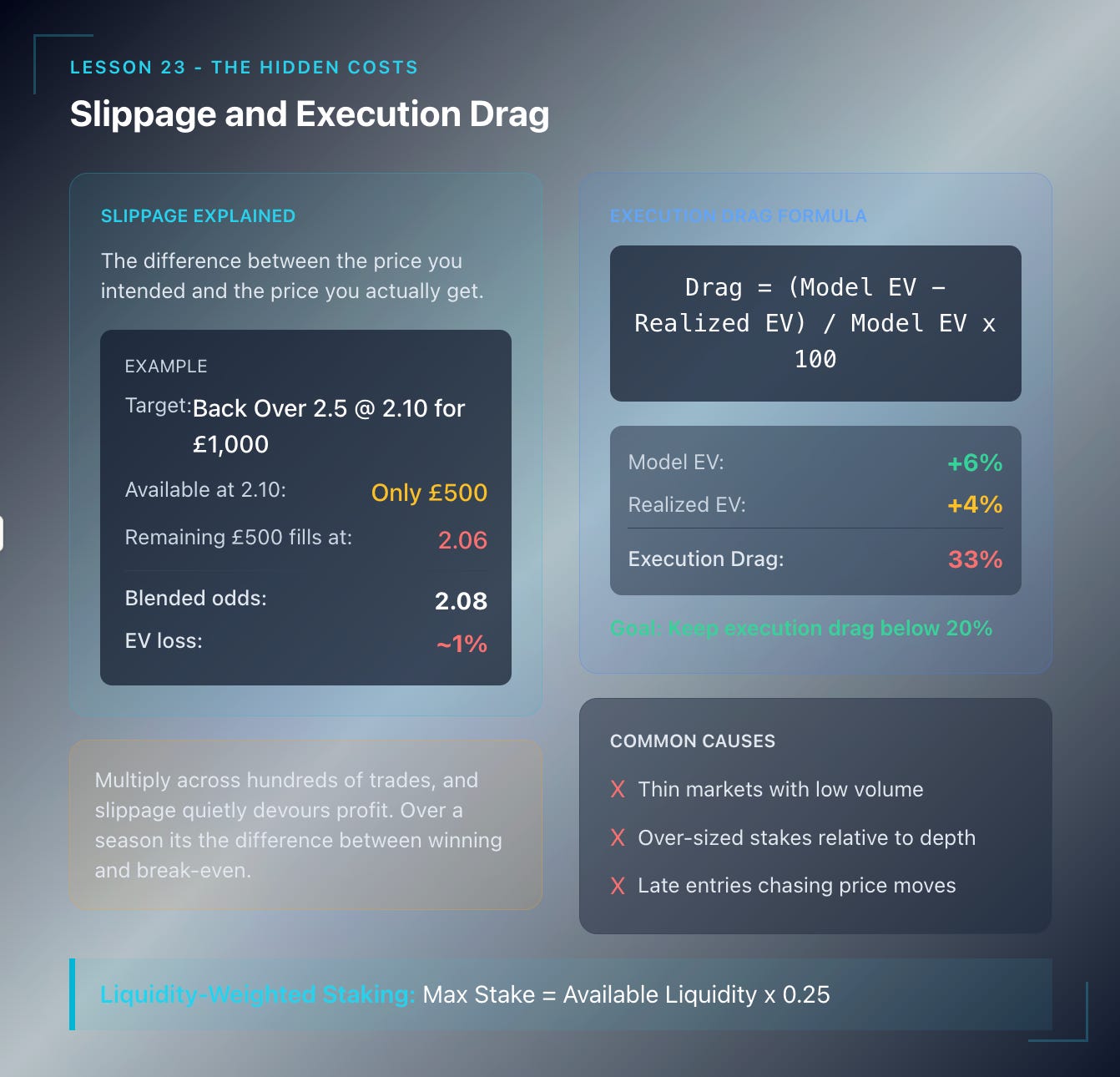 \text{Execution Drag} = \frac{\text{Model EV} - \text{Realized EV}}{\text{Model EV}} \times 100