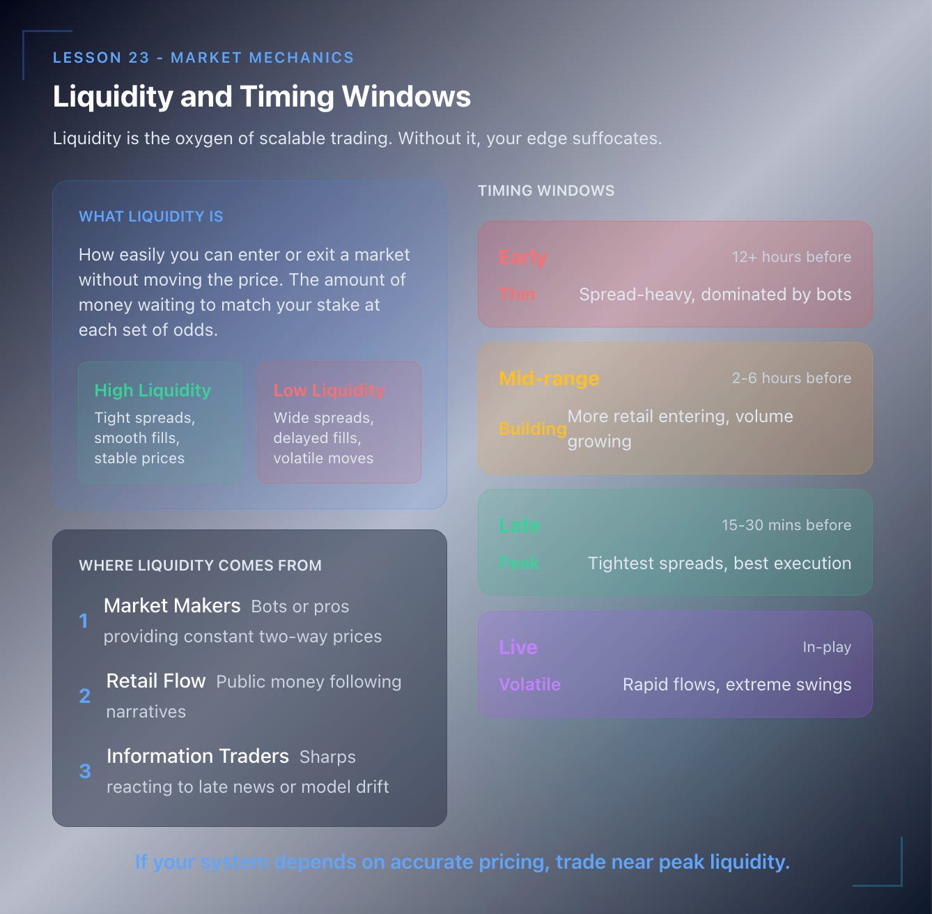 This lesson explains the mechanics of liquidity, order depth, and slippage. And how to master them so your realized returns match your theoretical edge.