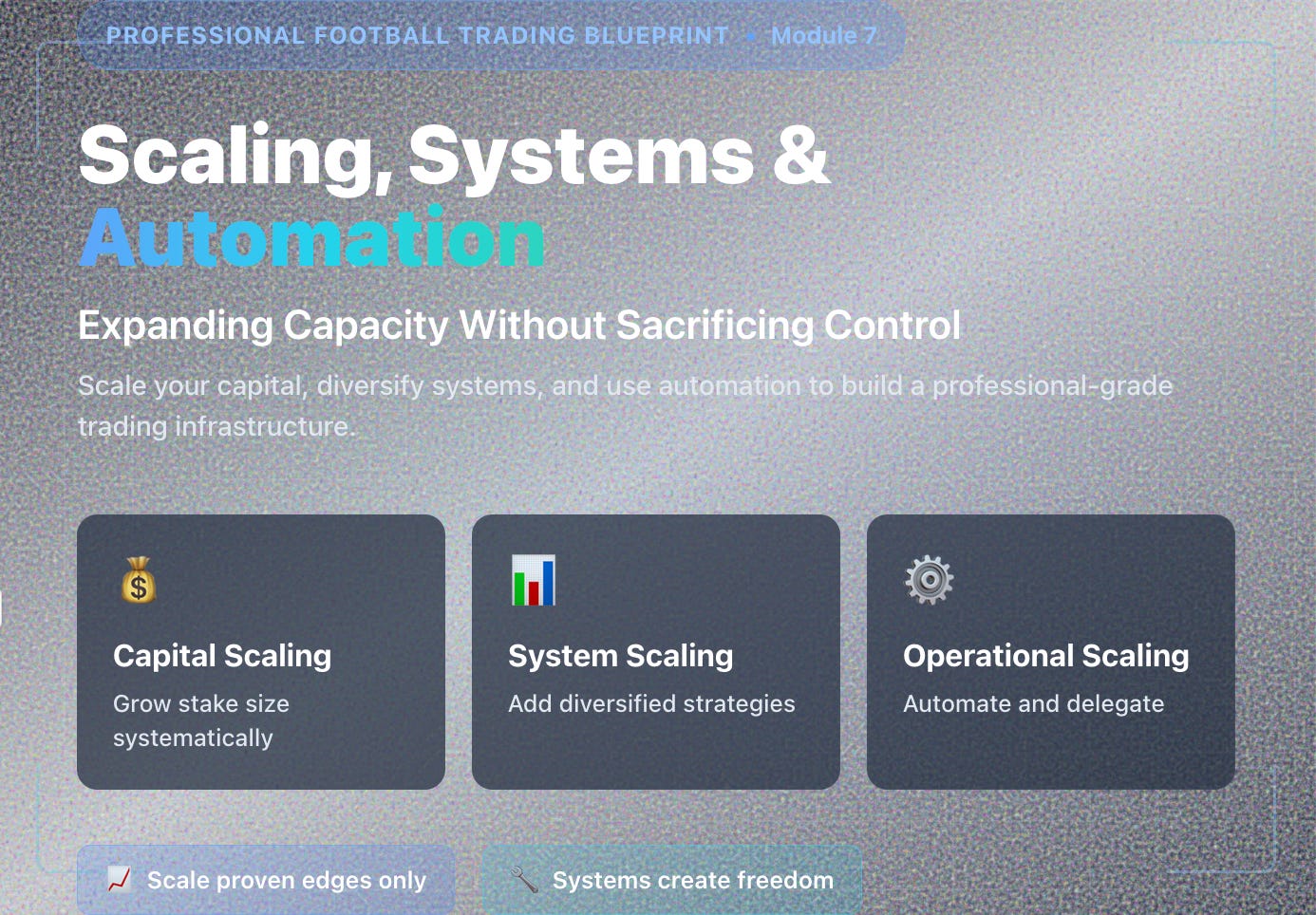 In this module, you’ll learn how to scale your capital, diversify systems, and use automation to build a professional-grade trading infrastructure.