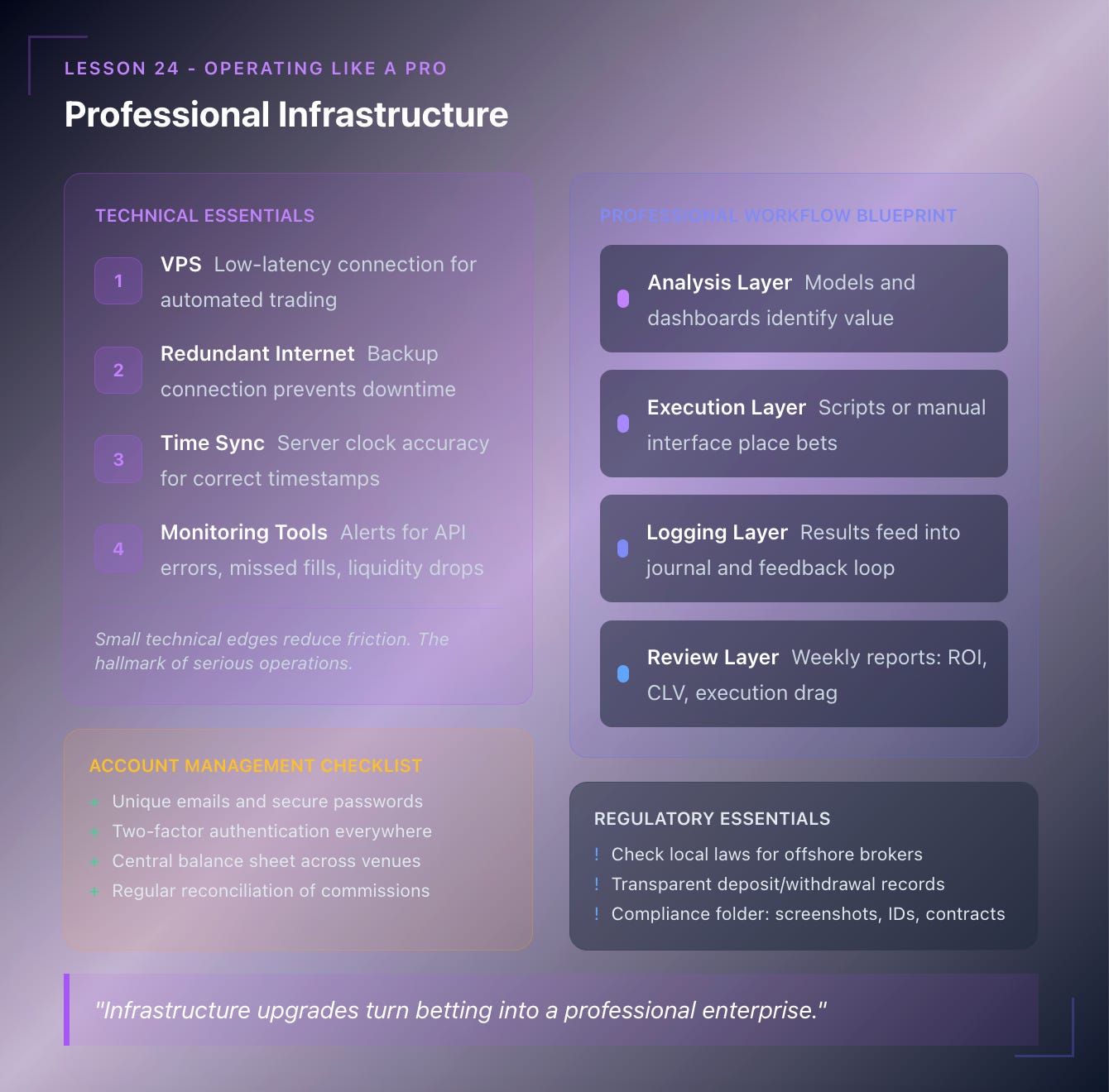 We’ll zoom out from systems to structure. Showing you how professionals organize workflow, manage capital flow, track performance KPIs, and run betting as a sustainable business rather than a hobby.