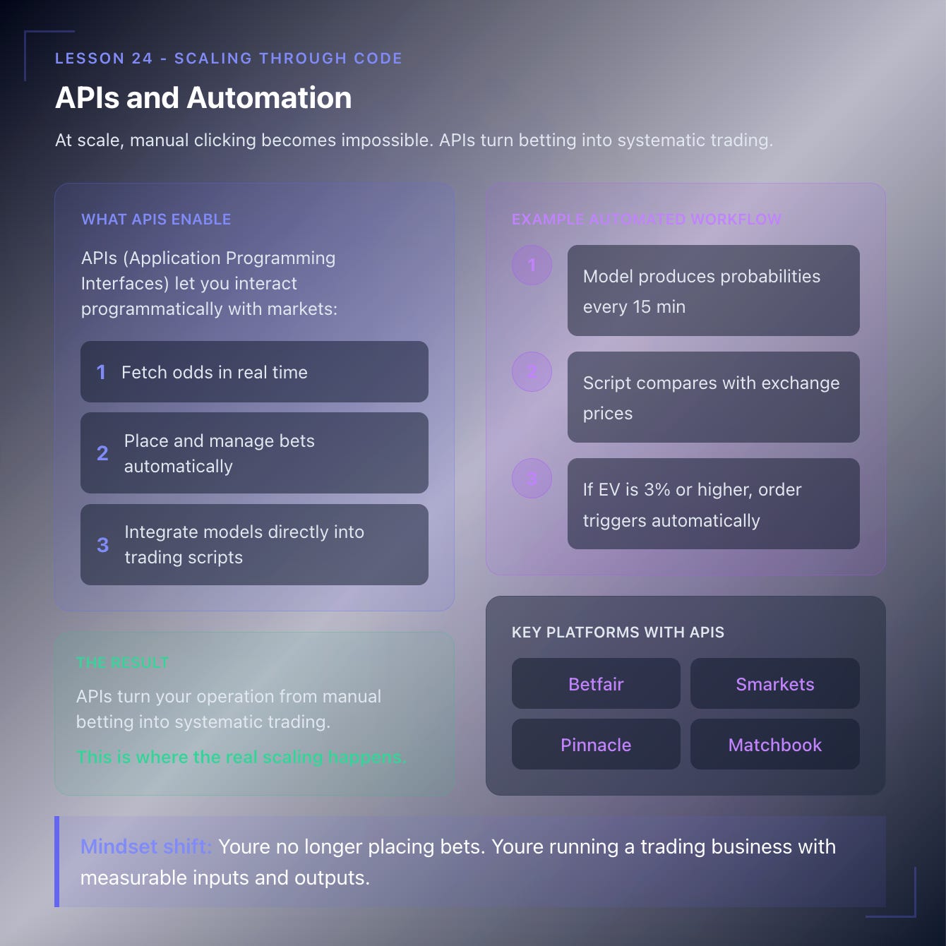 APIs turn your operation from manual betting into systematic trading. This is where the real scaling happens.