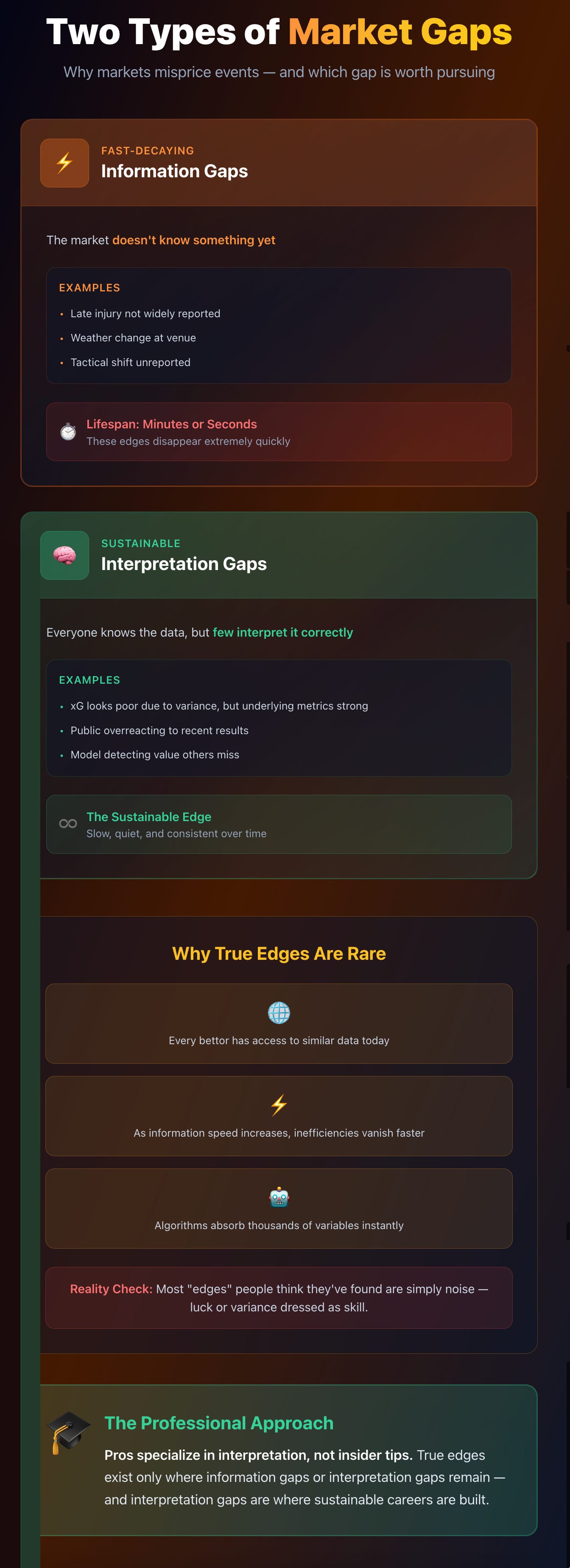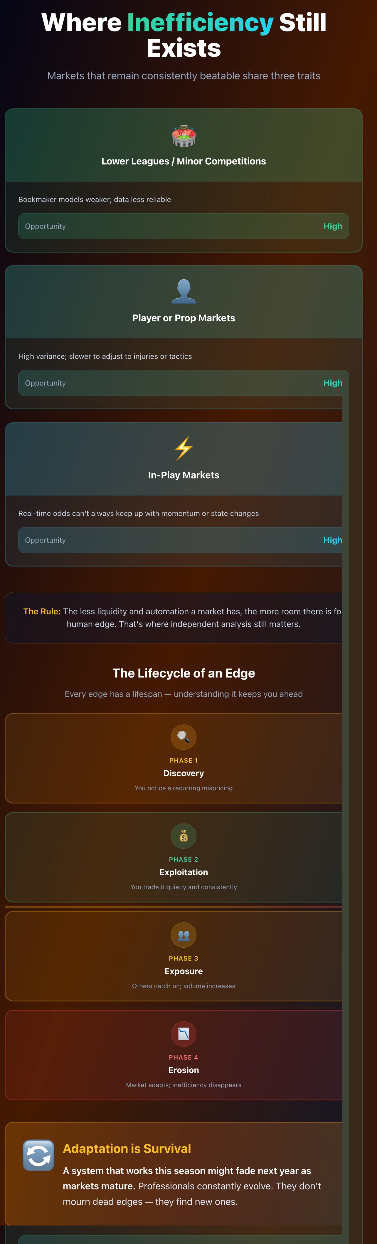 Some markets are near-perfect (like Premier League match odds), while others (smaller leagues, niche props, or in-play situations) contain exploitable inefficiencies.