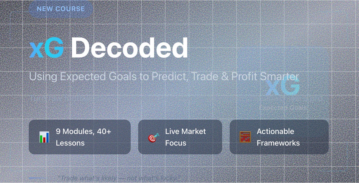 Blog⚽ xG Decoded: Using Expected Goals to Predict, Trade & Profit SmarterTurn raw football data into trading precision.xGeniusJan 15, 2026∙ PaidShare⚽ xG Decoded: Using Expected Goals to Predict, Trade & Profit Smarter.Understand probability like a pro. Trade what’s likely — not what’s lucky.Continue reading this post for free, courtesy of xGenius.Claim my free postOr purchase a paid subscription.Previous