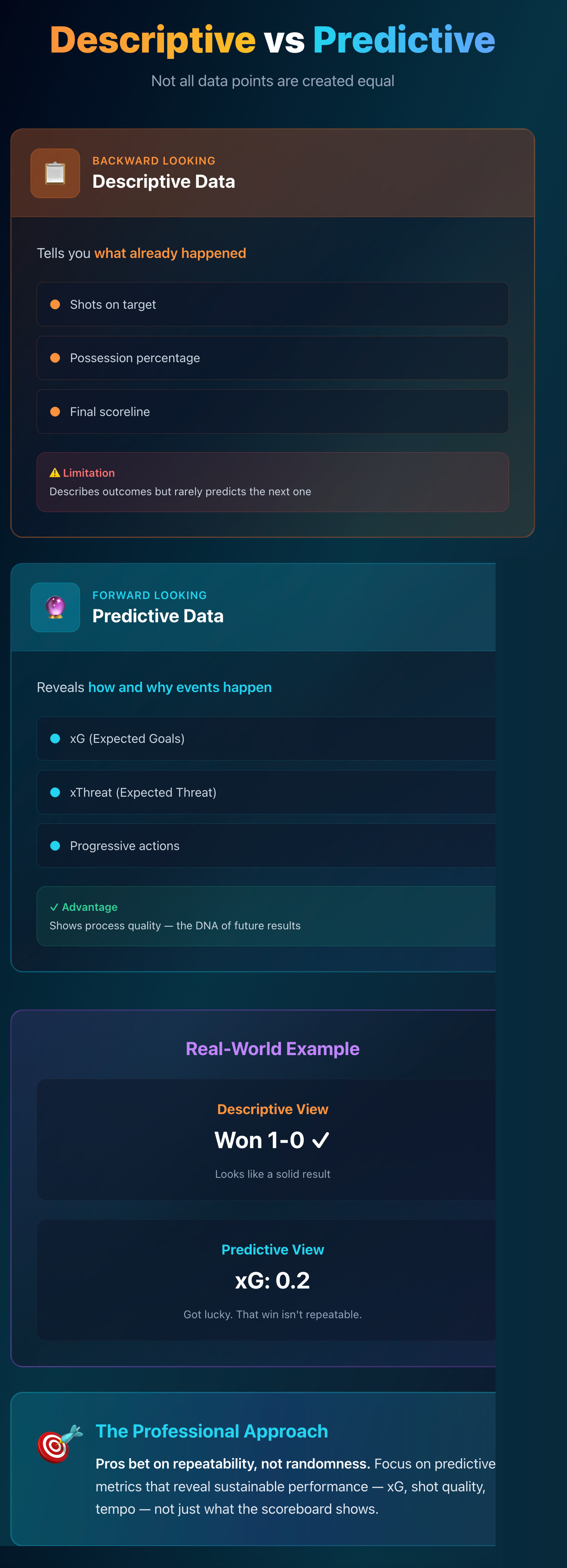 A team can win 1-0 with a single lucky goal (descriptive), but if their xG was 0.2 and they were dominated, that win isn’t repeatable (predictive).