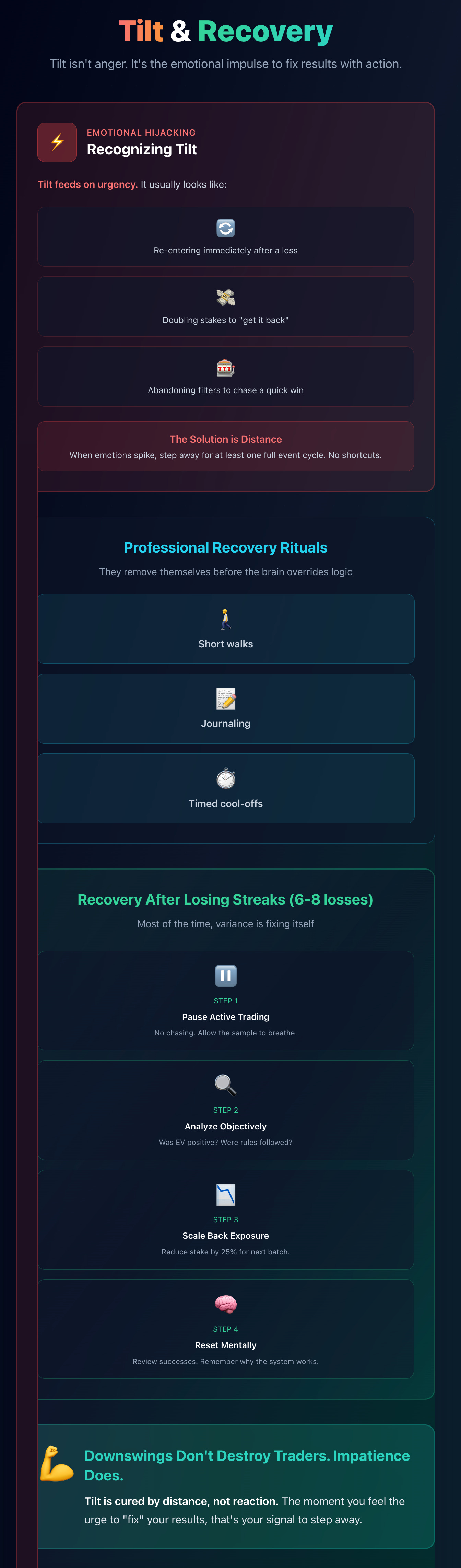 When emotions spike, step away for at least one full event cycle. No shortcuts here.