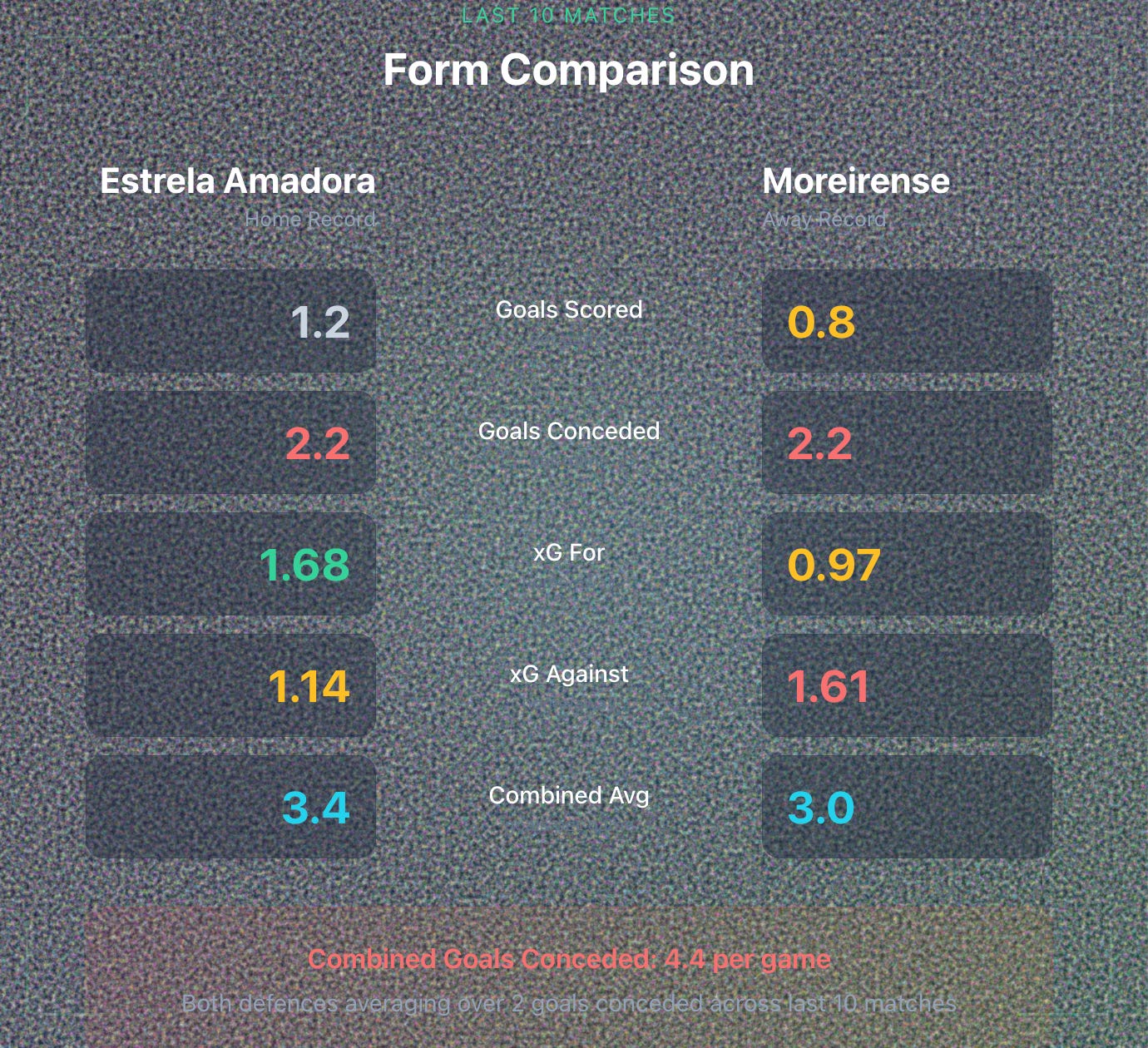 Two sides with defensive vulnerabilities meet in a fixture the model flags for goals. Estrela Amadora have conceded 22 in their last ten. Moreirense have shipped exactly the same.
