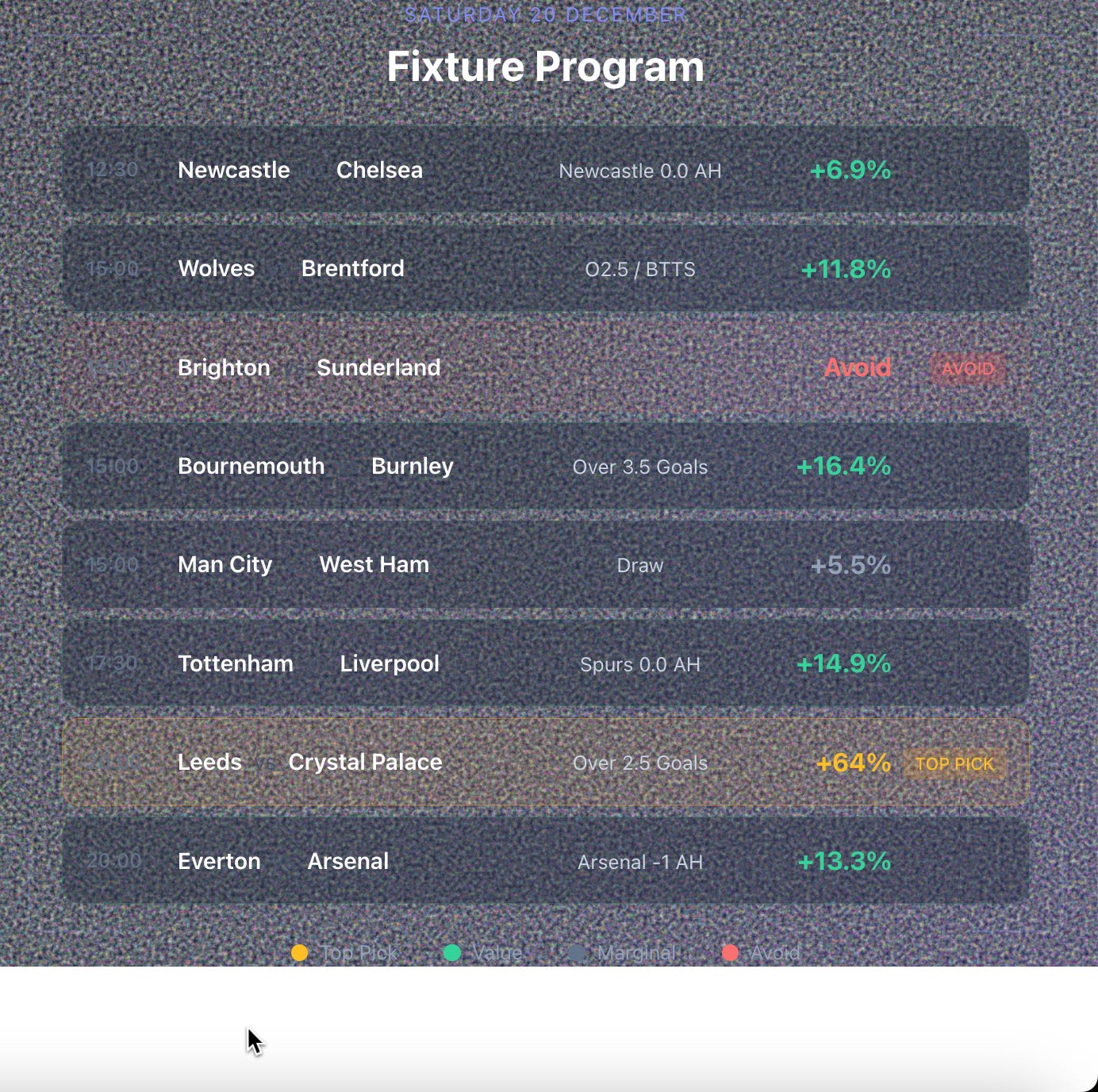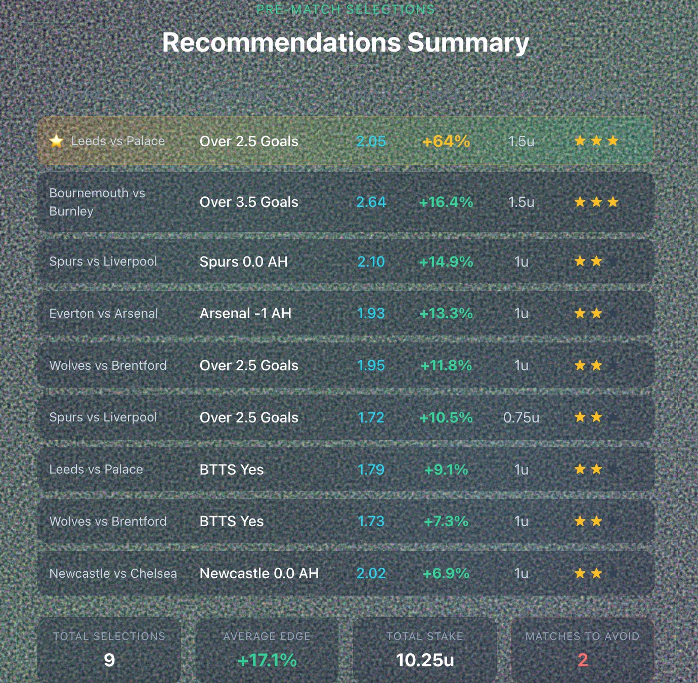 Saturday’s fixture list offers exceptional value on Leeds vs Crystal Palace — an edge of that magnitude is rare. The Spurs DNB and Bournemouth O3.5 are the next strongest plays. Wolves and Newcastle provide solid supporting angles.