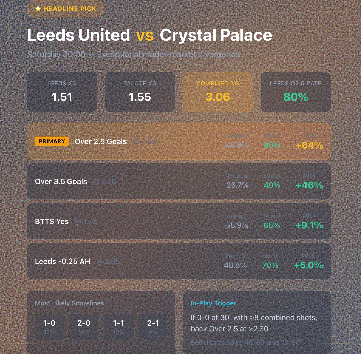 The Over 2.5 edge is exceptional. Combined xG of 3.06 (Leeds 1.51, Palace 1.55) supports the model thesis.