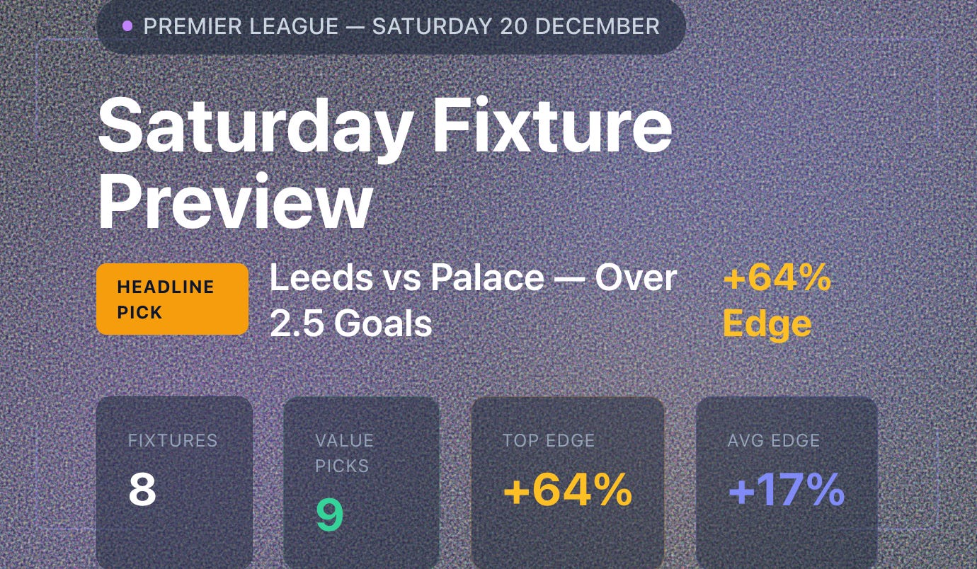 Eight Premier League fixtures on Saturday, and the models have identified several meaningful discrepancies between market pricing and true probabilities.