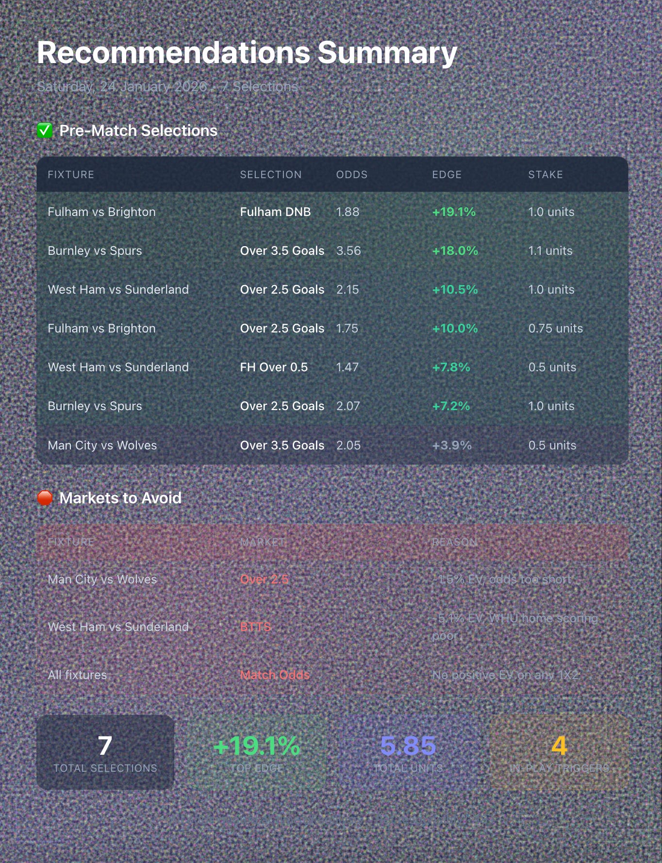 Four fixtures, six selections, all positive EV. The in-play triggers are there if conditions materialise.