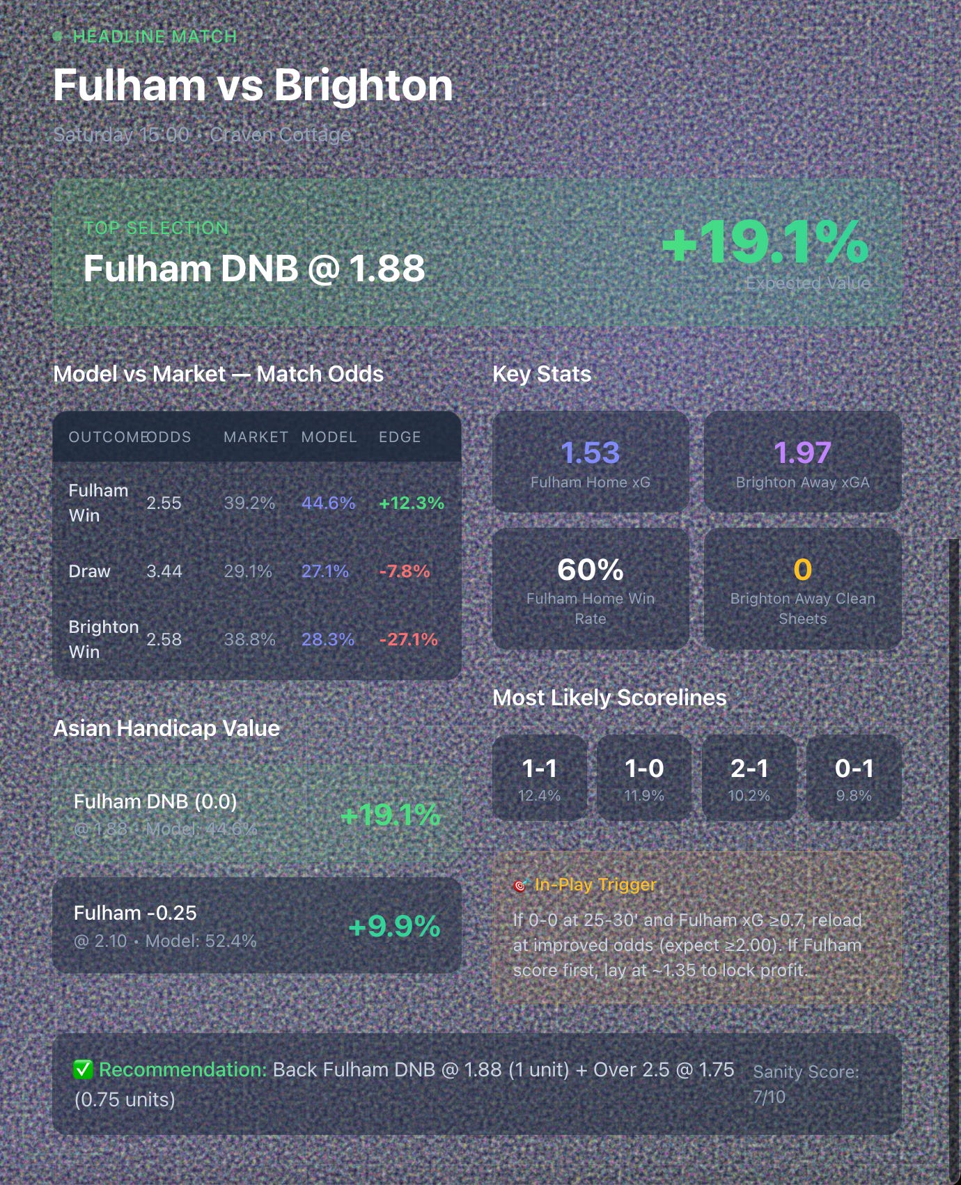 ✅ Fulham 0.0 AH (DNB) @ 1.88 — Edge +19.1%, Confidence 7/10
