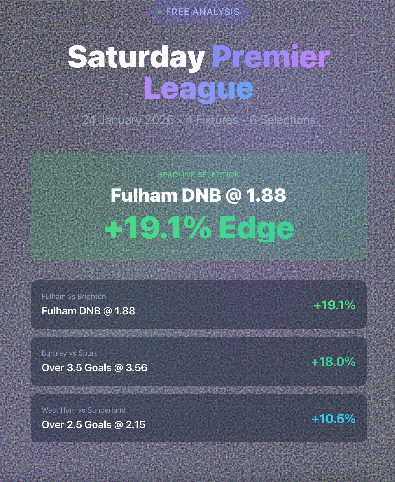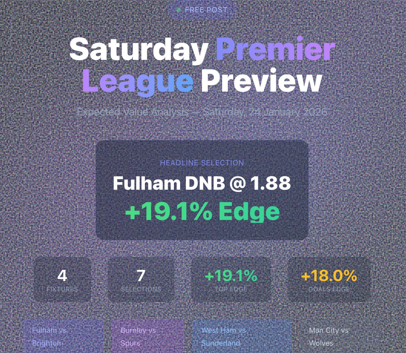 Saturday’s fixture list offers exceptional value on Fulham DNB — an edge approaching 20% is rare in Premier League markets. The Burnley O3.5 provides a strong secondary play at attractive odds.