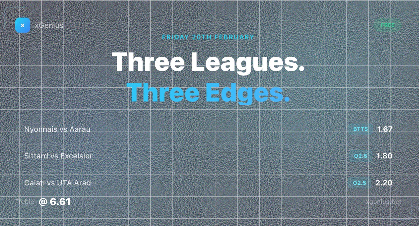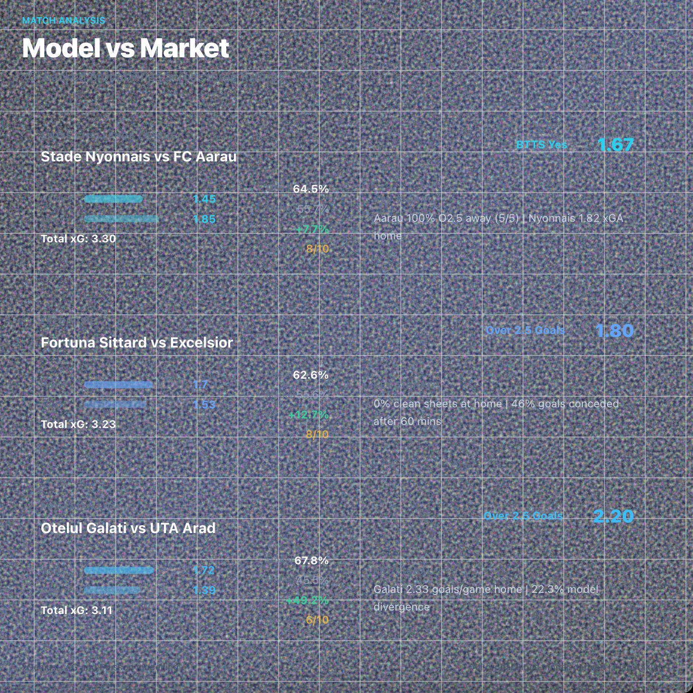 Three fixtures tonight across three different leagues. Three models that all agree: the market is underpricing goals.
