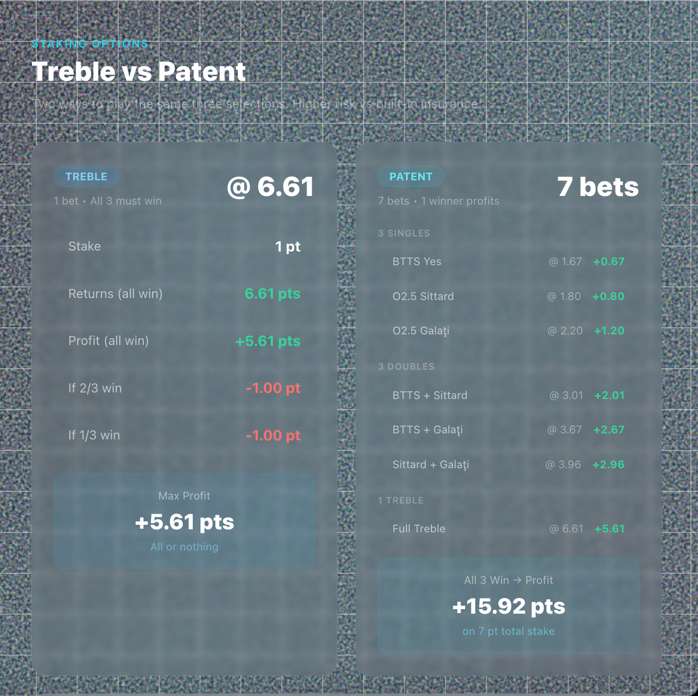 The combined EV across the treble is strong. Individual legs are solid enough to back as singles. The patent gives you good coverage.