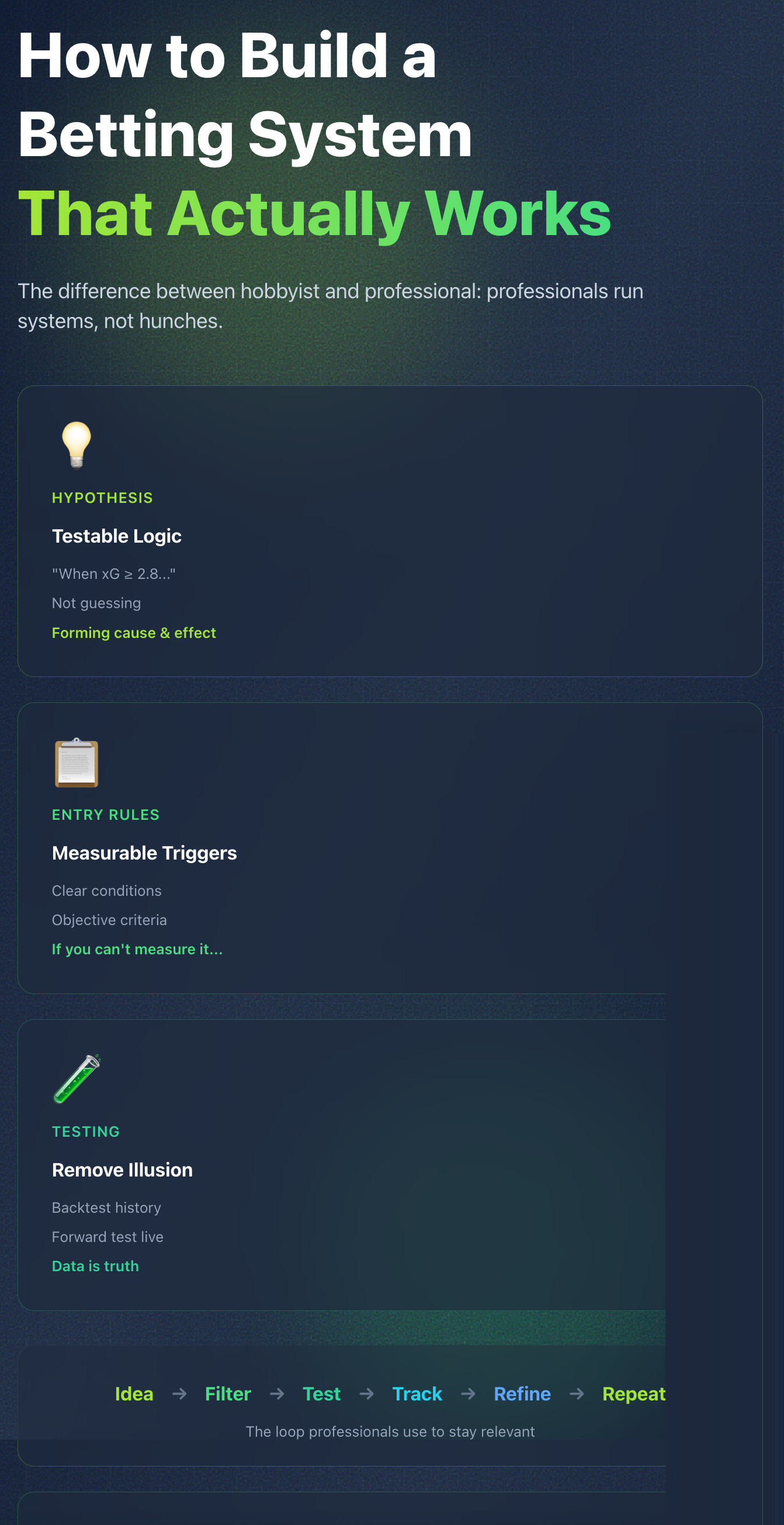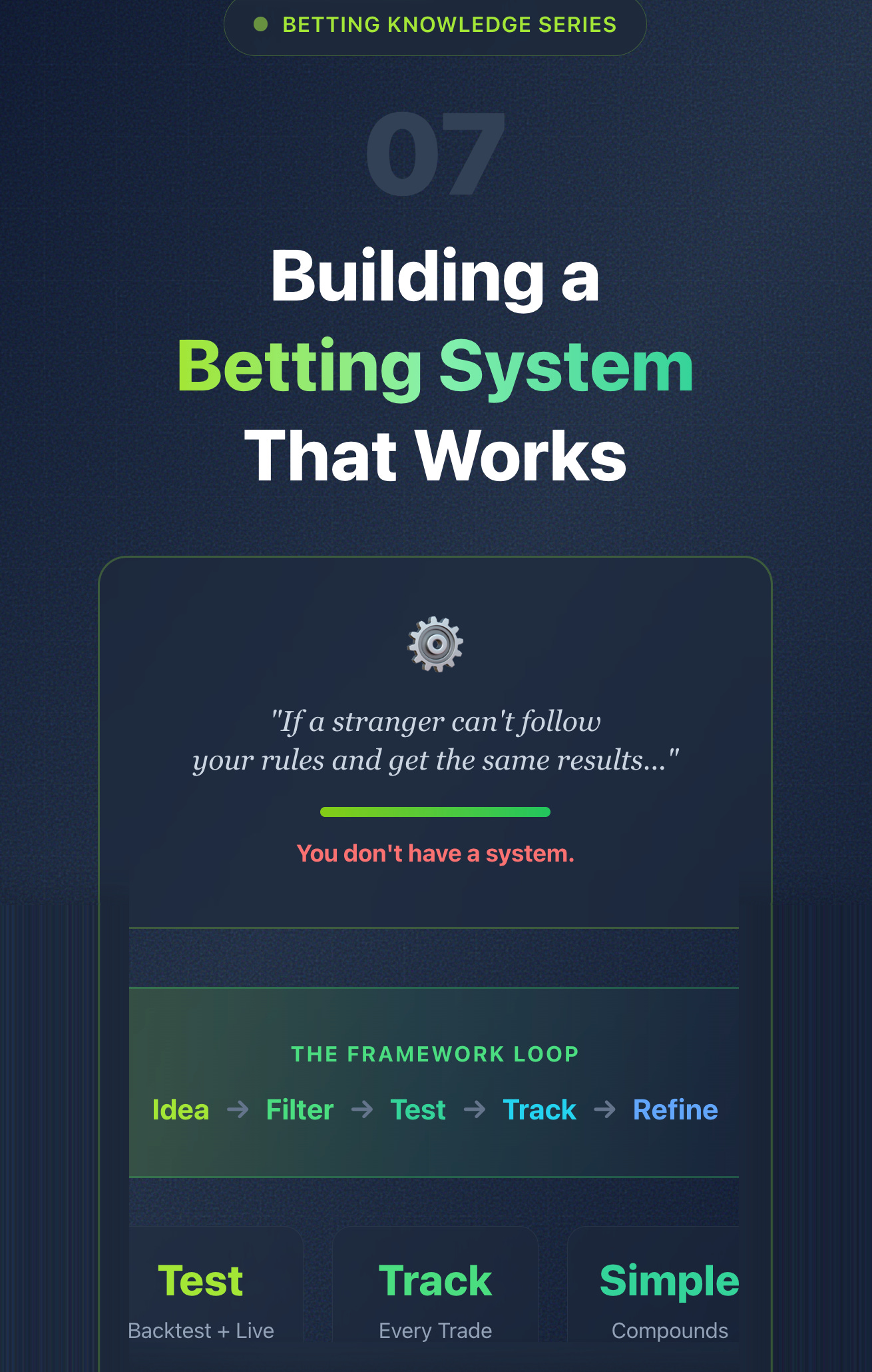 In this lesson, you’ll learn how to design, test, and refine a betting system that stands up to real data, not just good feelings.