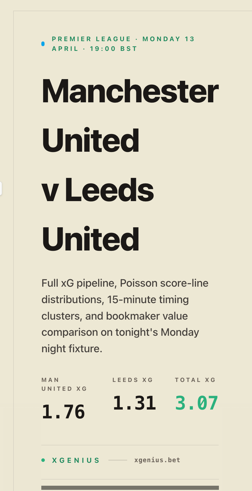 Monday night football at Old Trafford. Manchester United host Leeds in the evening kick-off, and our team has run the complete analysis: last-ten xG form, first-half and second-half goal splits, 15-minute timing clusters, Poisson score-line distributions, and bookmaker value comparisons.