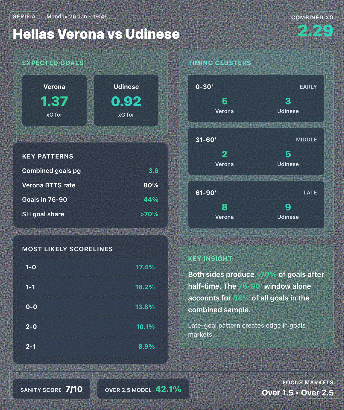 xG modesty — Combined xG of 2.29 sits below the Over 2.5 threshold. The edge comes from timing patterns, not raw attacking output.