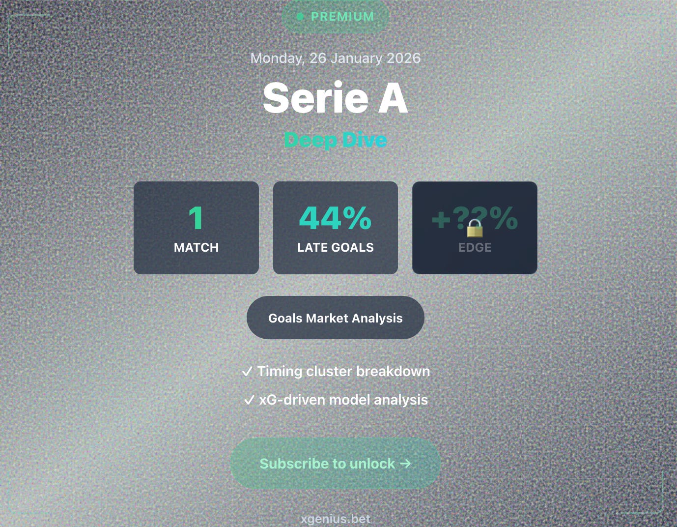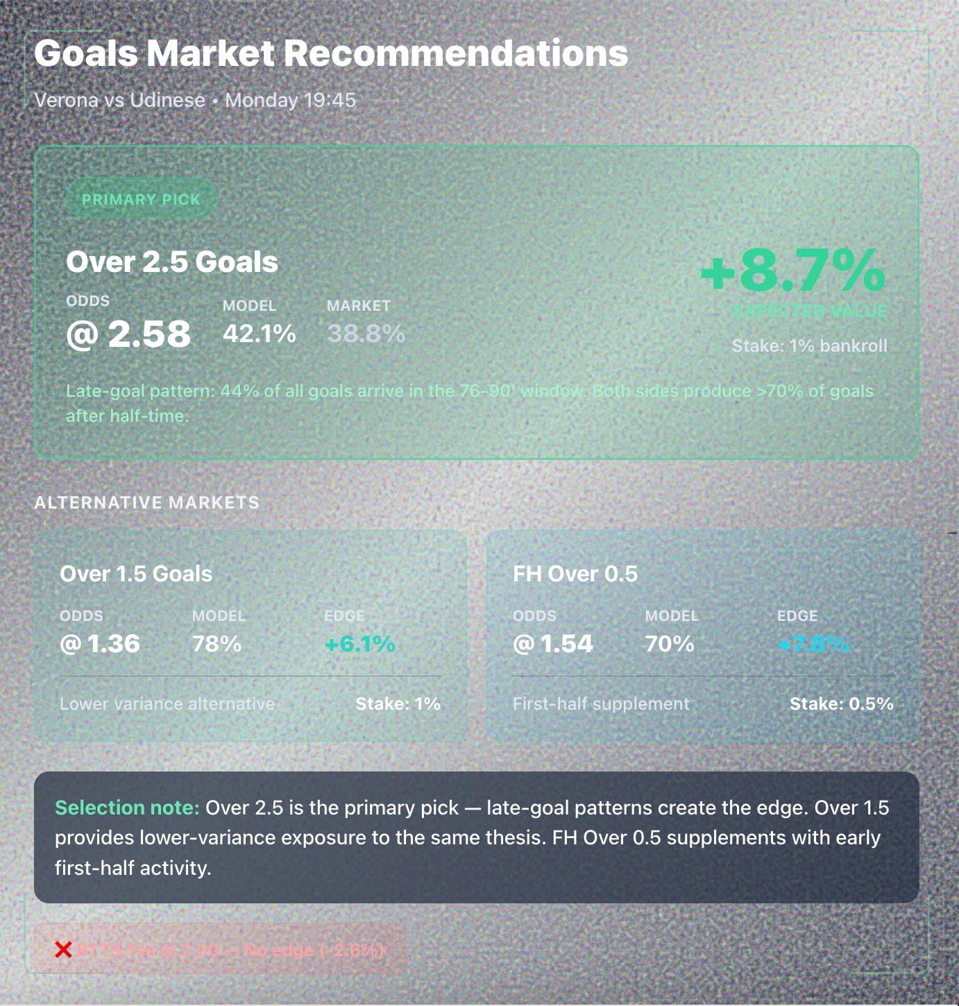 The model sees value where the market doesn’t — specifically in the goals markets where timing patterns create opportunity.